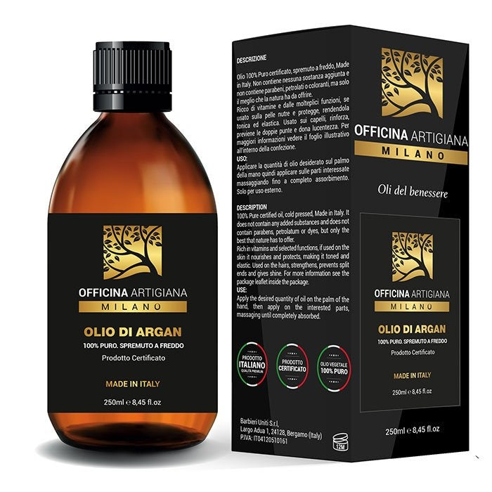 Officina Artigiana Milano 100% Pure Certified Argan Oil biedt een natuurlijke en luxe verzorging voor huid en haar. Deze hoogwaardige olie, puur en biologisch, wordt gewonnen uit Marokkaanse argannoten en staat bekend om zijn voedende en hydraterende eigenschappen. Rijk aan vitamine E en essentiële vetzuren, dringt het diep door om de huid te hydrateren, te herstellen en te beschermen tegen uitdroging en vroegtijdige veroudering. Voor het haar biedt het glans, versterking en bescherming tegen schade door hitte en omgevingsfactoren. Ideaal voor wie op zoek is naar een veelzijdige en effectieve natuurlijke verzorging met een vleugje luxe.