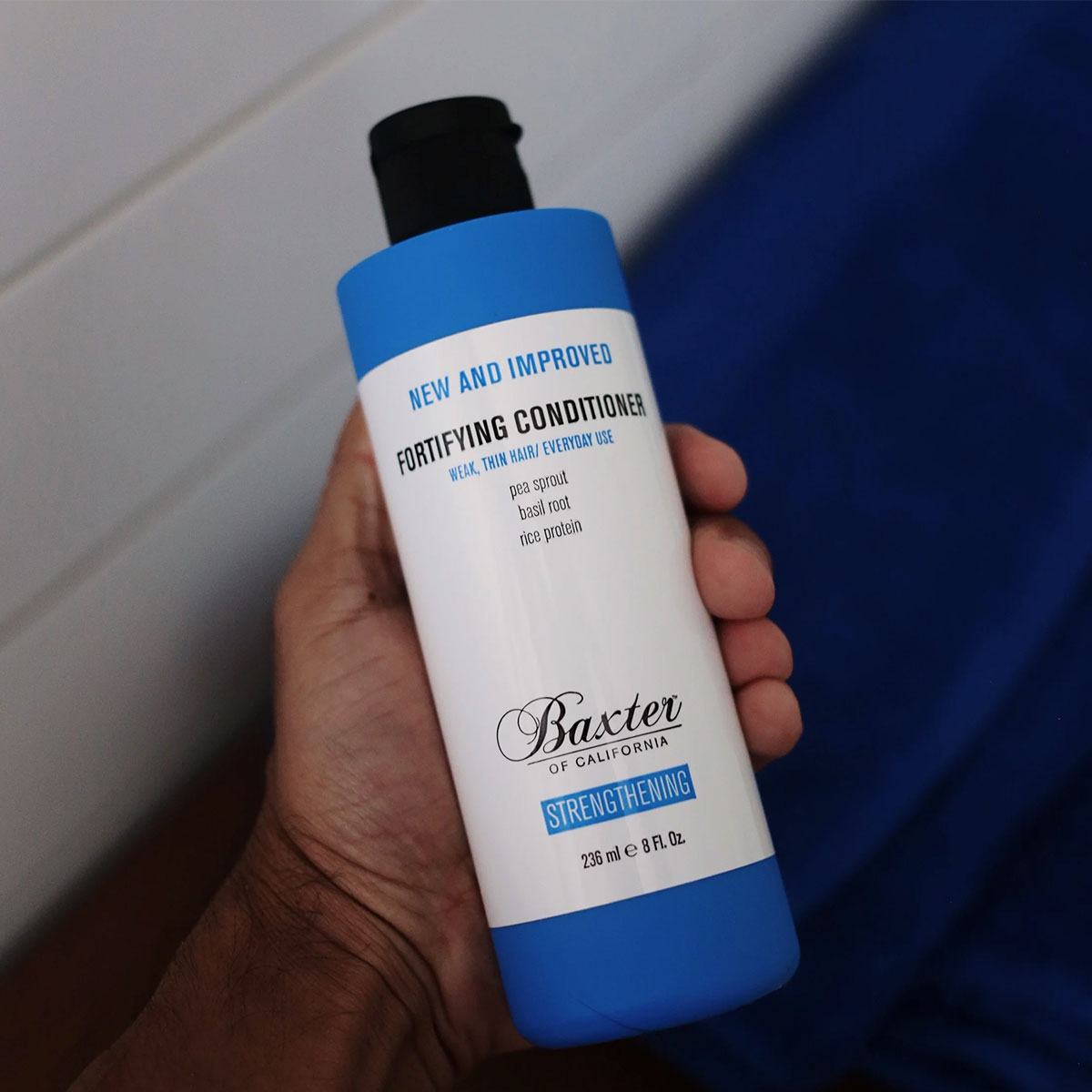 Baxter of California Fortifying Conditioner is een hoogwaardige conditioner die je haar versterkt en hydrateert. Geformuleerd met erwtenscheuten, basilicumwortel en rijstproteïnen, werkt deze conditioner om je haar te verdikken, te voeden en te versterken. Het biedt diepe hydratatie en een verkwikkende muntsensatie die je haar niet alleen reinigt, maar ook een frisse en schone geur geeft. Klinisch en dermatologisch getest voor veilig en effectief gebruik.