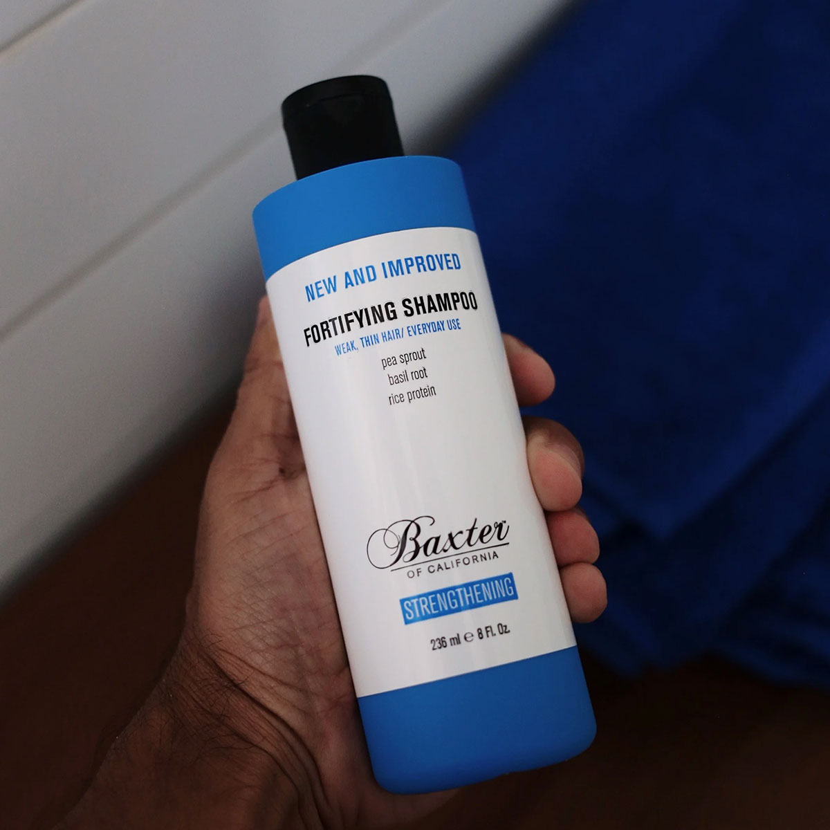 Baxter of California Fortifying Shampoo is doelgericht ontwikkeld om haaruitval te verminderen en de haarstructuur te versterken. De formule is verrijkt met erwtenscheuten, basilicumwortel en rijstproteïnen, die zorgvuldig zijn samengesteld om zwak en dun haar aanzienlijk dikker en voller te maken. Deze shampoo biedt niet alleen een verkwikkende muntsensatie die je zintuigen prikkelt tijdens je routine, maar laat je haar ook fris en heerlijk schoon ruiken. Klinisch en dermatologisch getest voor veilig en effectief gebruik.