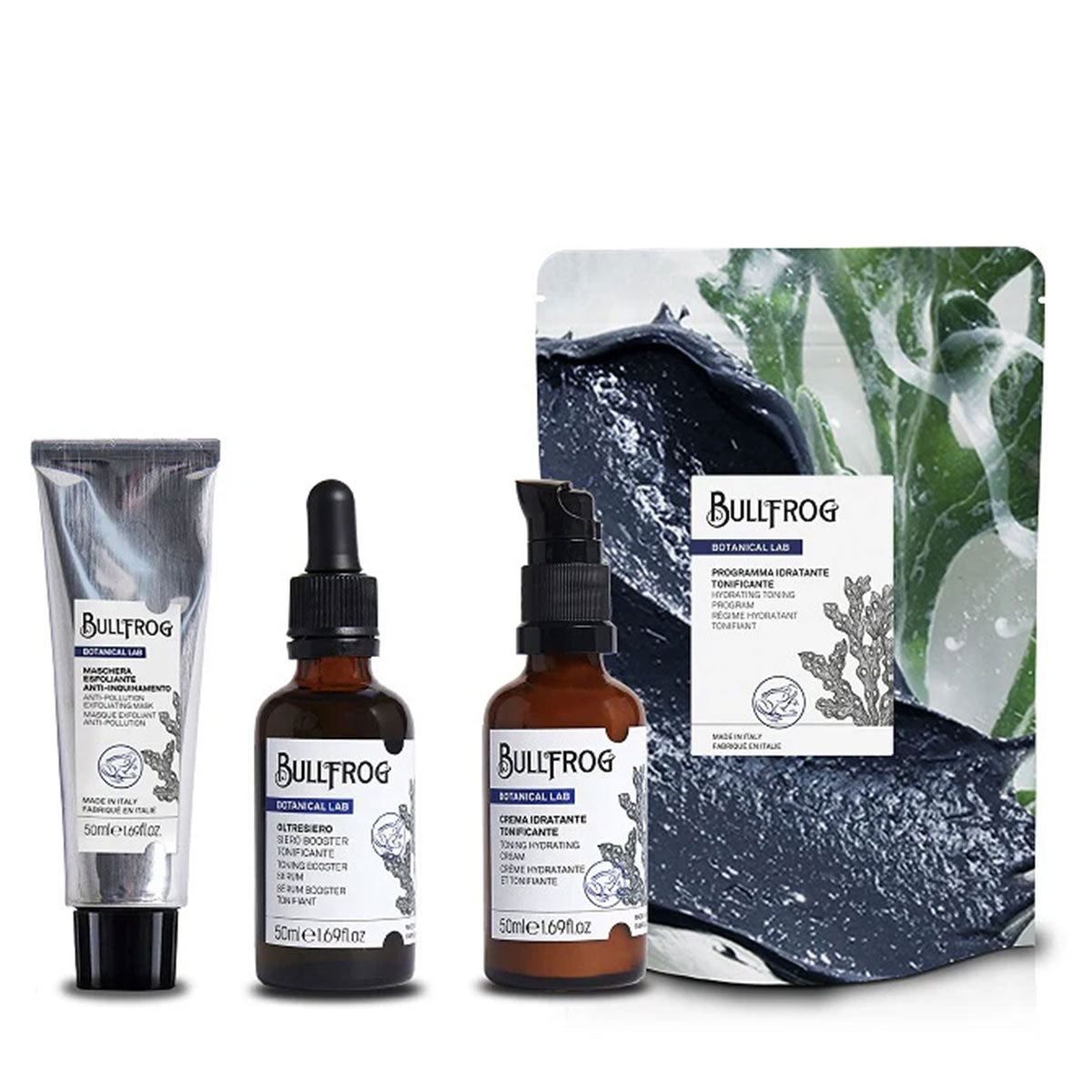 Bullfrog Anti-Pollution Moisturising Set combineert drie krachtige producten voor een revitaliserende huidverzorging. Het Exfoliating Mask verwijdert dode huidcellen, terwijl het Oltresiero Toning Booster Serum langdurige hydratatie biedt en beschermt tegen veroudering. De Toning Hydrating Cream verzacht, verstevigt en behoudt vocht, ondersteund door natuurlijke ingrediënten zoals algenextract, azuleen, pinus pinaster en wordt afgerond met een subtiele, natuurlijke geur van cederhout, leer en citroenessence.
