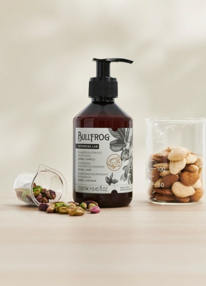Bullfrog Nourishing Restorative Shampoo bezit een geur herinnert aan de omhullende noten van pistache en amandel, en is perfect voor liefhebbers van verfijnde en aromatische tonen.