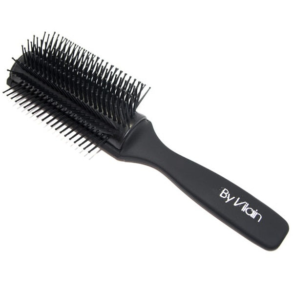 By Vilain 9 Row Brush belichaamt hoogwaardige materialen en doordacht ontwerp voor een optimale haarverzorgingservaring. Deze borstel is voorzien van negen rijen nylon borstelharen die zorgvuldig zijn ontworpen om moeiteloos door het haar te glijden zonder trekken of breken. Het antistatische rubberen kussen van de borstel zorgt voor een soepele beweging en voorkomt dat het haar tijdens het kammen statisch wordt. Dit kussen biedt niet alleen comfort tijdens het kammen, maar ook maximale grip en controle tijdens het föhnen. De combinatie van de flexibele borstelharen en het antistatische kussen maakt de By Vilain 9 Row Brush ideaal voor het ontwarren, stylen en föhnen van verschillende haartypes.