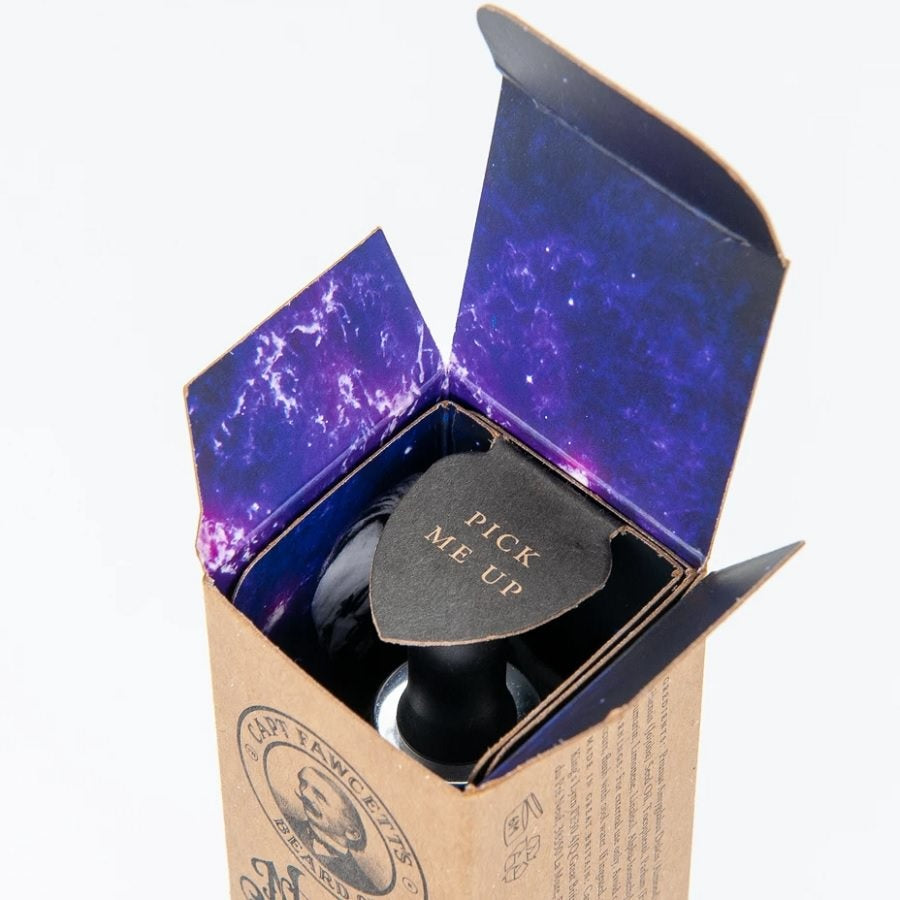 Captain Fawcett Nebula Baardolie biedt een meeslepende geursensatie. Het begint met opwindende topnoten van bergamot en aromatische mirte, verweven met een bitterzoete toets van grapefruit. Deze geur ontvouwt zich naar een intens hart van aardse, violette orris, donkere koffie en hardnekkig houtachtige ceder. Een pulserende vleug van verleidelijke muskus volgt, met een rokerige achtergrondnoot die doordrenkt is met vetiver en luxueus leer. De geurcombinatie wekt een aura van avontuur en elegantie op, waardoor de Captain Fawcett Nebula Baardolie een ware zintuiglijke ervaring is.