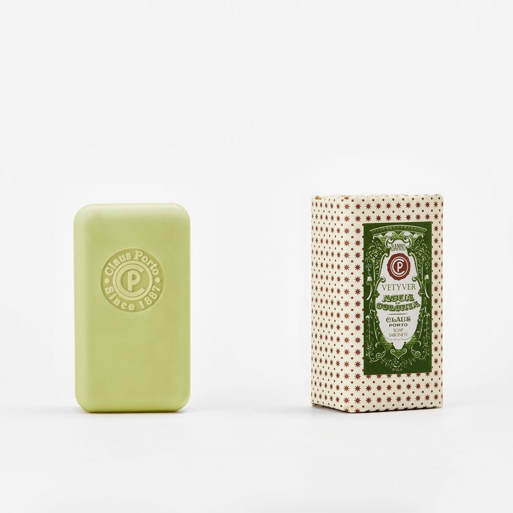 Claus Porto Soap Bar Mini Agua Colonia Vetyver biedt een mannelijke en tijdloze geur met zijn frisse en houtachtige karakter. De geur opent met heldere citrusnoten, gevolgd door de aardse, rokerige nuances van vetiver, die zorgen voor een elegante en gebalanceerde geur. Deze luxe zeep, handgemaakt in Portugal, is verrijkt met 100% plantaardige oliën, waardoor de huid op milde wijze wordt gereinigd en verzorgd. De rijke, romige schuimtextuur laat de huid zacht en gehydrateerd aanvoelen, terwijl de stijlvolle verpakking met vintage uitstraling een vleugje Portugese traditie toevoegt. Perfect voor dagelijks gebruik of als luxe cadeau.