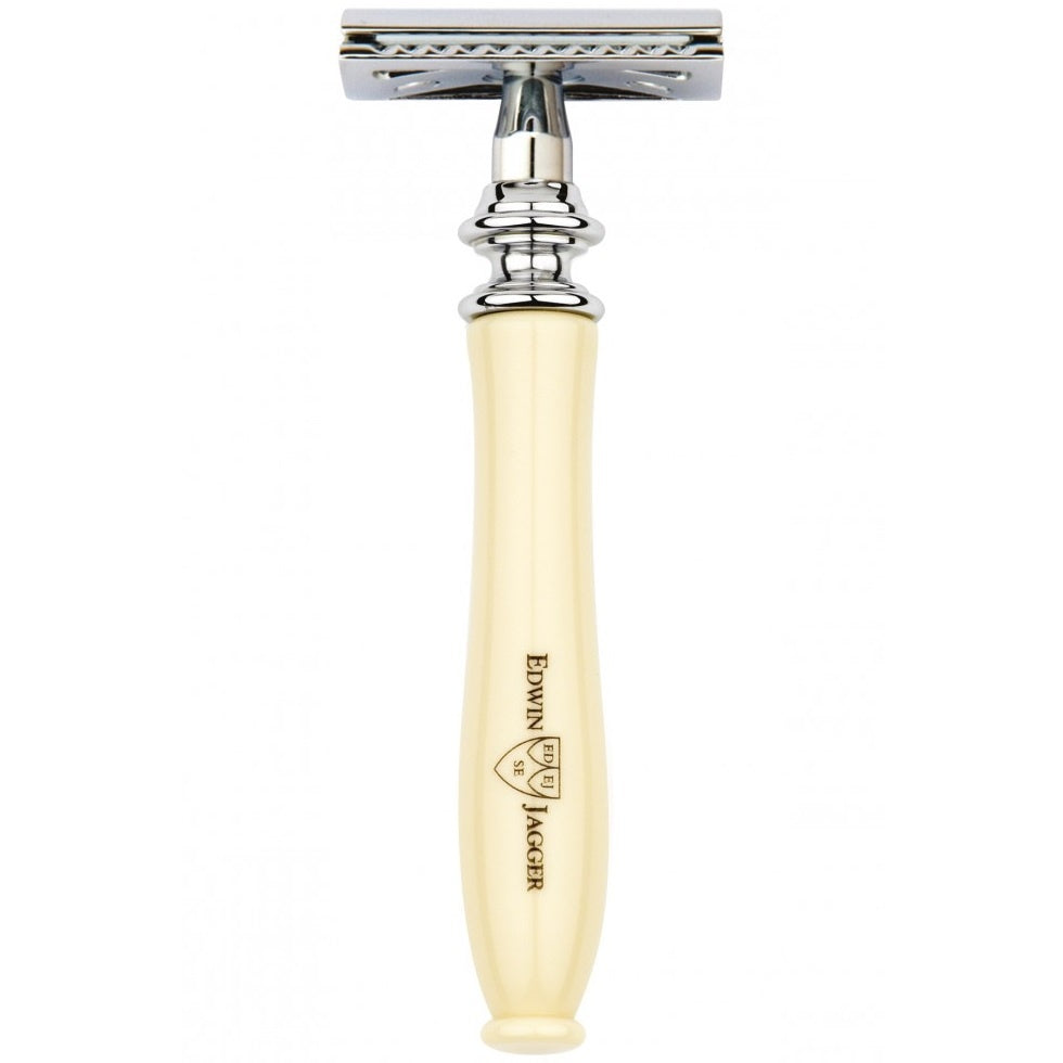 Edwin Jagger Chatsworth Double Edge Safety Razor Ivoor is uitgerust met een verchroomd scheermes die uitzonderlijk corrosiebestendig is, waardoor het langdurig zijn luxe uitstraling behoudt, zelfs bij intensief gebruik. Het ivoorkleurige edelkunsthars handvat biedt niet alleen een comfortabele grip tijdens het scheren, maar zorgt er ook voor dat het mes stevig in de hand ligt. Dankzij de combinatie van duurzame materialen en geavanceerde afwerking, zorgt dit scheermes voor een superieur scheerresultaat zonder in te boeten op kwaliteit of gebruiksgemak.