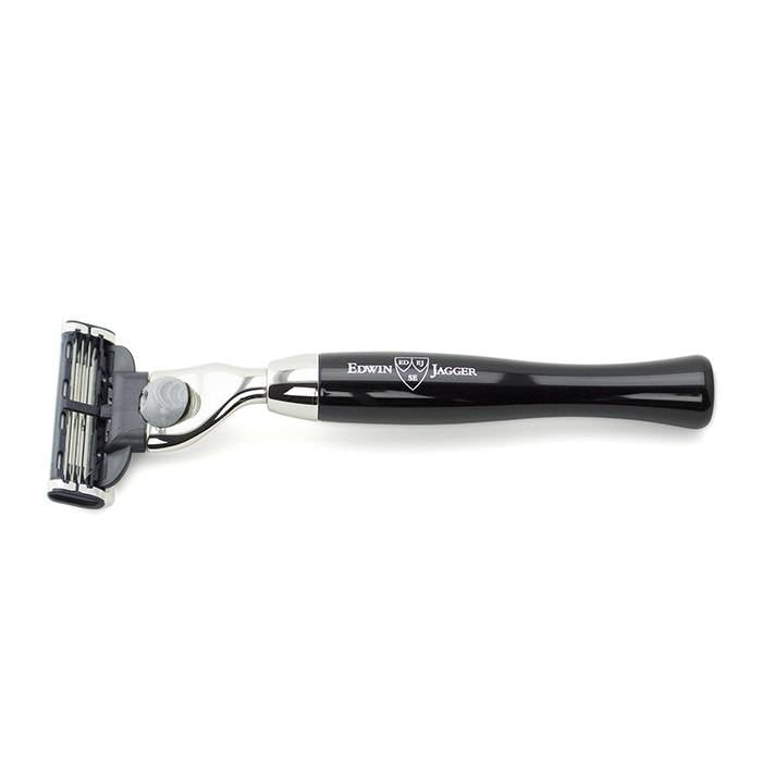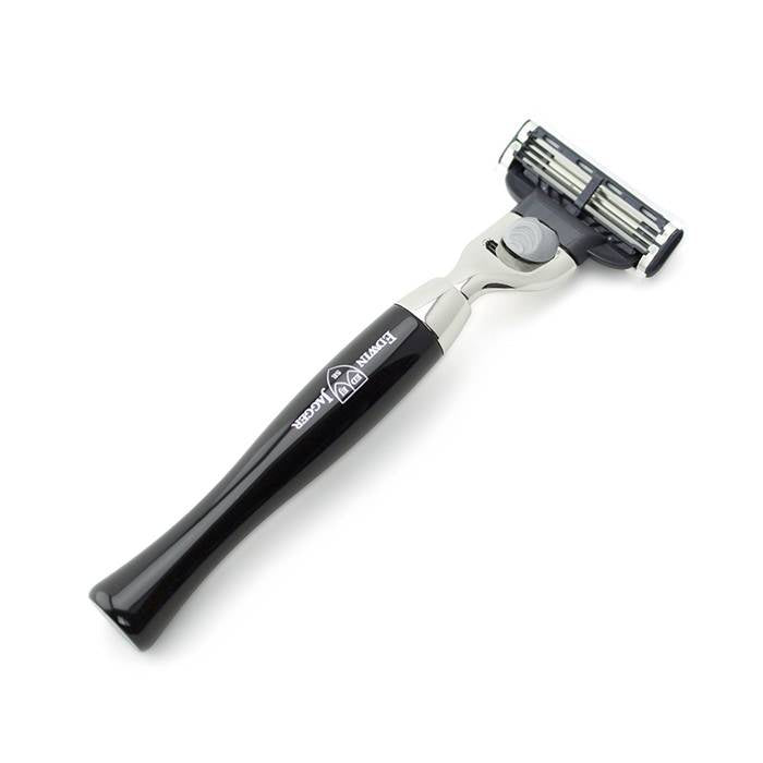 Edwin Jagger Mach3 Scheermes Zwart is ontworpen met een handvat van zwart edelkunsthars, dat een strak contrast vormt met de helder verchroomde accenten. Het gebruik van dit materiaal zorgt voor een luxe uitstraling en biedt tegelijkertijd een uitstekende grip en controle. Het scheermes is geschikt voor de Gillette® Mach3™ scheermesjes, waardoor je verzekerd bent van een glad, comfortabel en veilig scheerresultaat. Het hoogwaardige handvat maakt het eenvoudig om het mes stevig vast te houden, wat de precisie van je scheerbeurt ten goede komt.