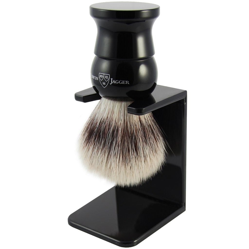 Edwin Jagger Scheerkwast Silvertip Fibre Zwart is een hoogwaardige scheerkwast met een elegant kunststof handvat. De kwast is gevuld met synthetisch silvertip dassenhaar, dat zorgt voor een luxueuze en comfortabele scheerbeleving. Dit moderne alternatief voor traditioneel dassenhaar biedt een zachte, volle borstel die rijkelijk schuim opbouwt, ideaal voor een gladde en efficiënte scheerbeurt. Het kunststof handvat biedt een stevige grip en de synthetische haren zijn duurzaam en eenvoudig te onderhouden, waardoor deze scheerkwast perfect is voor dagelijks gebruik.