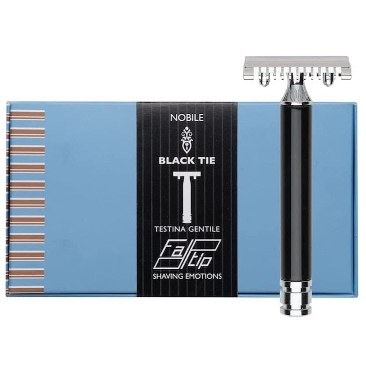 Fatip Safety Razor Nobile Black Tie – Open Kam is een stijlvol en functioneel scheermes dat ontworpen is voor een effectieve en comfortabele scheerbeurt. Het mes heeft een open kam die zorgt voor een iets agressievere scheerbeurt, ideaal voor wie wat meer precisie en controle wil. Dankzij het uitgebalanceerde gewicht en het ergonomische handvat ligt het stevig in de hand, wat het scheren makkelijker maakt. Dit scheermes combineert tijdloos design met praktische eigenschappen, geschikt voor dagelijks gebruik.