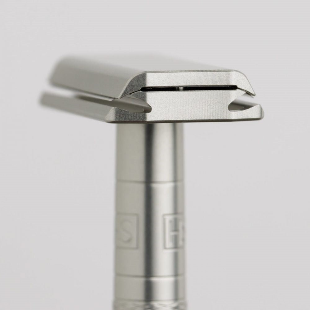 Henson Shaving Safety Razor AL13 Medium Aircraft Aluminium is vervaardigd uit hoogwaardig aluminium dat wordt gebruik in de ruimtevaart. Het gebruik van dit materiaal zorgt voor een lichtgewicht en duurzaam scheermes dat gemakkelijk in de hand ligt. Het ergonomische ontwerp van het handvat zorgt voor een comfortabele en veilige grip tijdens het scheren. De kop is uitgerust met een gesloten kam-ontwerp dat de messen veilig beschermt achter een metalen plaat, waardoor het risico op scheerwondjes en irritatie wordt verminderd. Dankzij deze hoogwaardige materialen verzekert dit scheermes een comfortabele scheerervaring.
