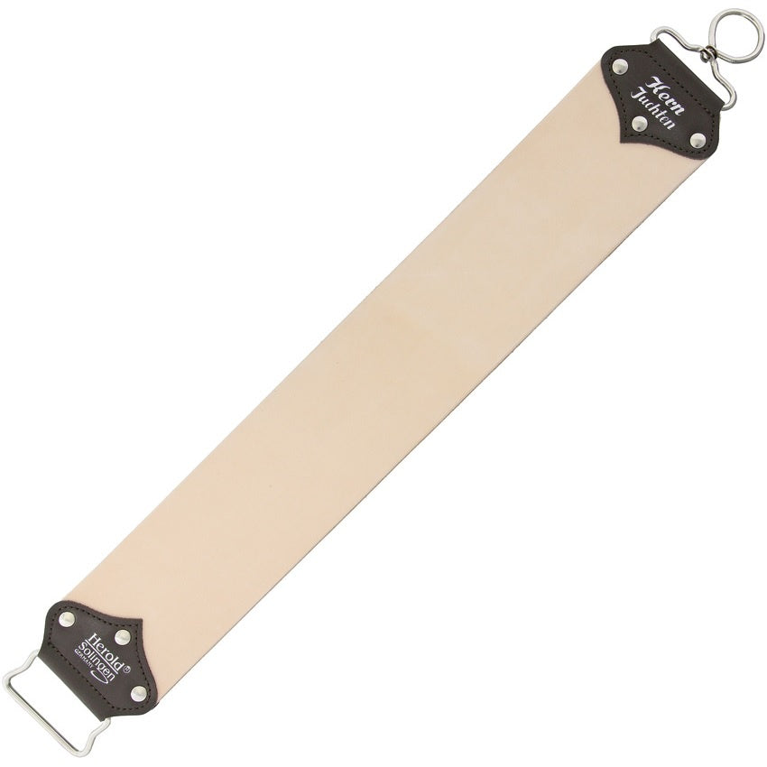 Herold Solingen Enkelzijdige Scheerriem XL is met vakmanschap handgemaakt van hoogwaardig rundleer, ideaal voor het polijsten van open scheermessen. Deze riem heeft een totale lengte inclusief beugels van 48cm en een werkbaar oppervlak van 38 x 8 cm. Het lederen deel van de scheerriem dient onderhouden te worden met gele pasta. De canvas achterzijde met de witte pasta. Essentieel voor het dagelijks onderhoud van open scheermessen, biedt deze riem de perfecte voorbereiding voor een gladde scheerbeurt wanneer opgehangen en strak getrokken aan een wand.