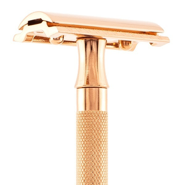 Merkur 24G Double Edge Safety Razor is een meesterwerk van vakmanschap en duurzaamheid. Het scheermes is zorgvuldig vervaardigd met een handvat van messing en een gegoten zinken scheerkop, met gegalvaniseerde oppervlakken die is afgewerkt met een pvd-coating in roségoud. De gesloten kam en het rechte sluitsysteem, dat een korte schroef en een driedelig veiligheidsscheermes omvat, zorgen voor een soepele scheerervaring. Met de Merkur 24G ervaar je niet alleen klassieke scheerkwaliteit, maar ook een scheermes dat ontworpen is om lang mee te gaan en te voldoen aan de hoogste standaarden in scheren. Dit scheermes biedt tijdloze elegantie en vakmanschap in één, waardoor het de perfecte keuze is voor heren die streven naar een professionele scheerervaring.