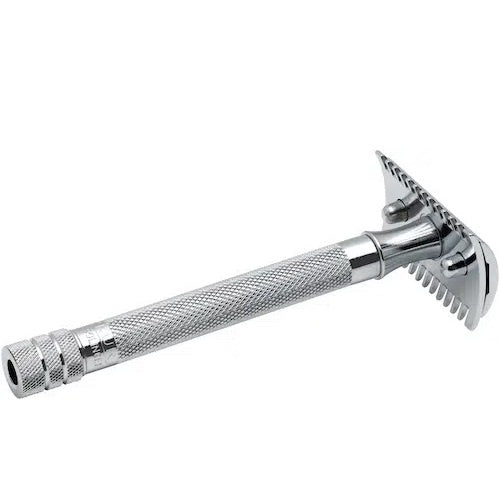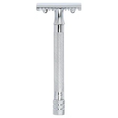 Merkur 25C Double Edge Safety Razor is vervaardigd uit hoogwaardige materialen, waaronder een messing handvat, een gegoten zinken en messing scheerkop, gegalvaniseerde oppervlakken en een glanzend verchroomde afwerking. Met een open kam en een recht ontwerp biedt deze safety razor efficiënt en grondig scheren. Het driedelige veiligheidsscheermes met een korte schroef sluitsysteem maakt het eenvoudig om scheermesjes te vervangen. Het een handvat biedt de Merkur 25C een comfortabele grip en optimale balans voor heren die streven naar een onberispelijke scheerervaring met een vleugje stijl.
