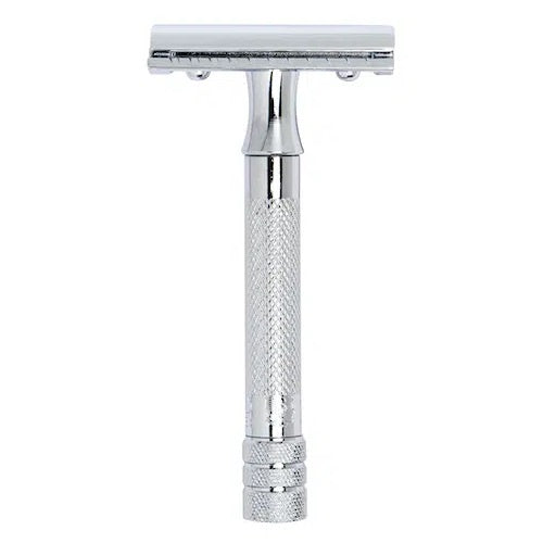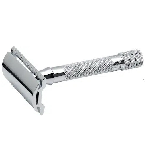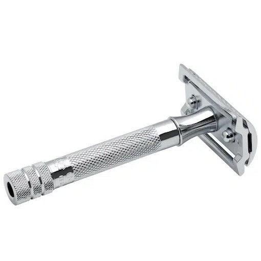 Merkur 33C Double Edge Safety Razor is gemaakt van hoogwaardige materialen die zorgen voor duurzaamheid en een verfijnde uitstraling. Het messing handvat biedt een stevige grip en langdurige prestaties, terwijl de gegoten zinken scheerkop stabiliteit en robuustheid garandeert. De gegalvaniseerde oppervlakken zorgen voor extra bescherming tegen slijtage, en de glanzend verchroomde afwerking geeft het scheermes een stijlvolle, tijdloze look. Deze combinatie van materialen maakt de Merkur 33C tot een betrouwbare en duurzame keuze voor dagelijks scheren