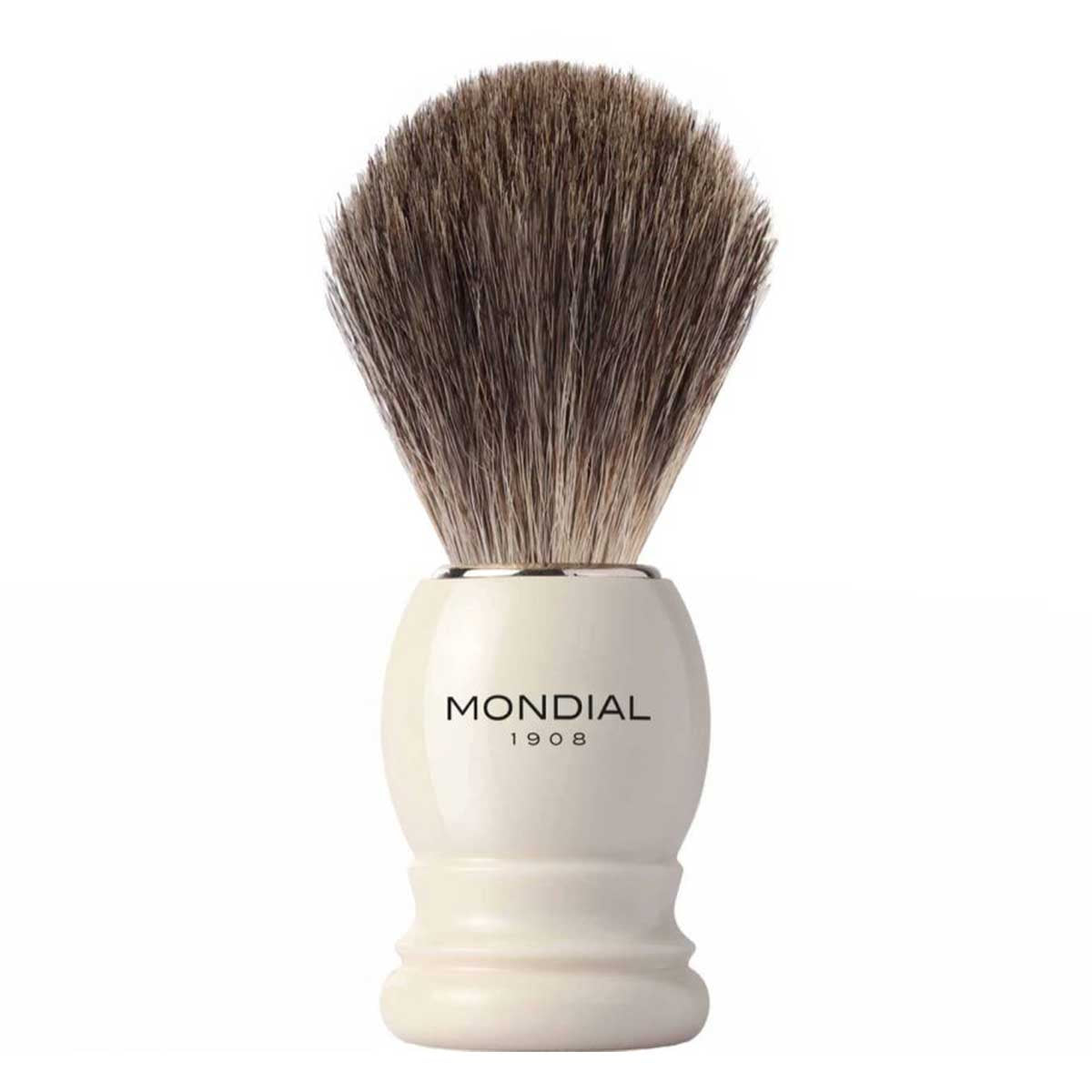 Mondial 1908 Scheerkwast Graudas Basic Ivoor is gemaakt met hoogwaardig grey badger dassenhaar, een van de beste materialen voor een luxe scheerervaring. Het haar heeft de unieke eigenschap om veel water vast te houden, wat zorgt voor een rijk en romig schuim. Of je nu scheert met een harde scheerzeep of een zachte scheercrème, de scheerkwast creëert moeiteloos een dichte schuimlaag voor een comfortabele en soepele scheerbeurt. Het kunststof handvat in ivoorkleur biedt een stevige grip, waardoor je de kwast gemakkelijk kunt hanteren. De haarbundel is in een waaiervorm gesneden, wat het masserende effect op de huid versterkt en tegelijkertijd zorgt voor een gelijkmatige verdeling van het schuim. De scheerkwast heeft een 19 mm knoopdikte en is volledig ambachtelijk gemaakt, met zorg voor detail in zowel het handvat als de haarbundel.