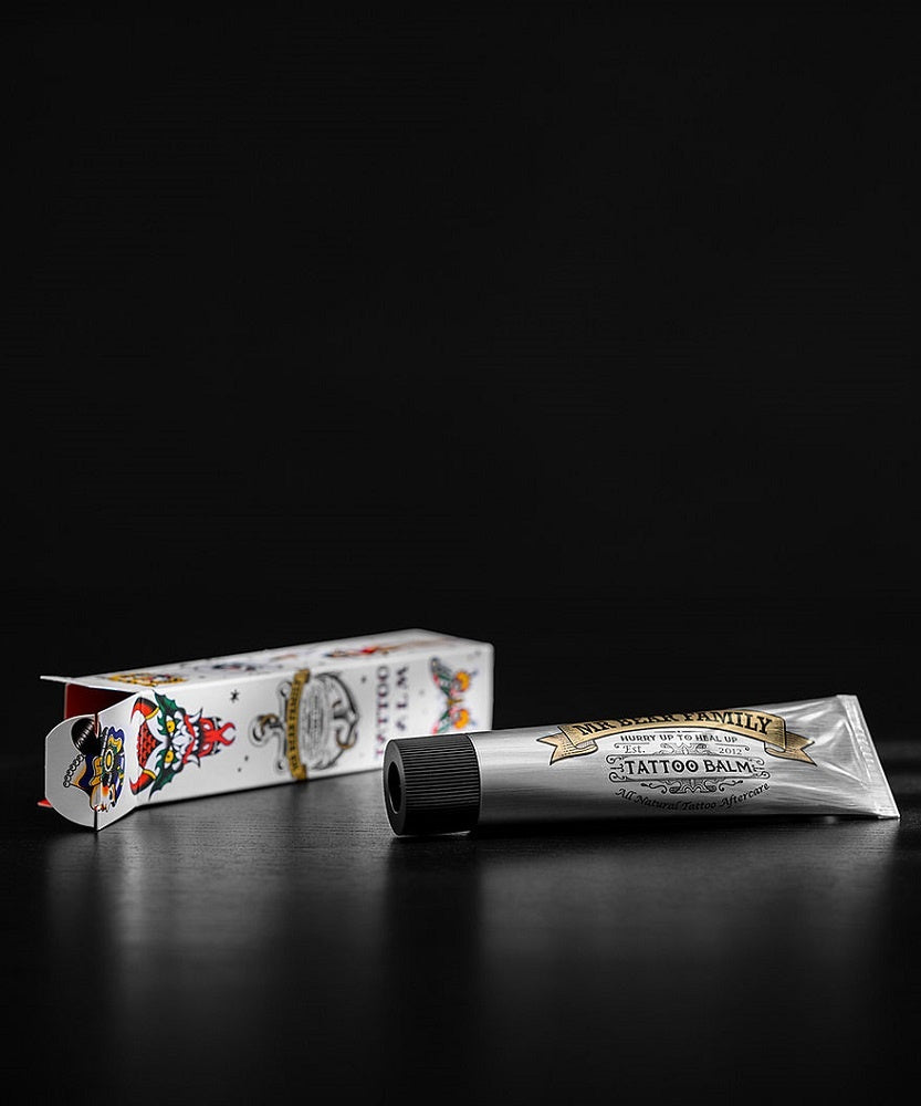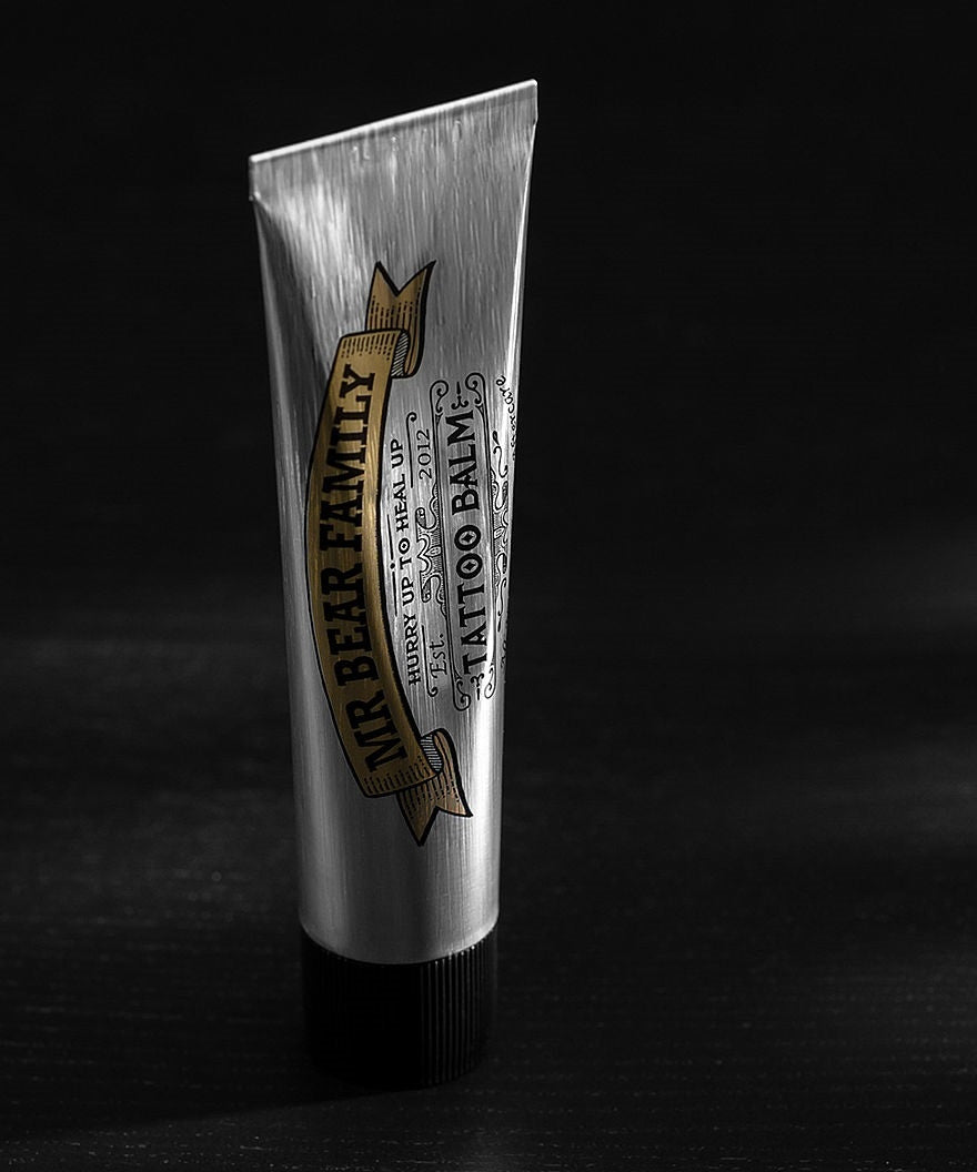 Mr Bear Family Tattoo Balm, een ongeparfumeerde balsem op oliebasis, onthult zijn krachtige formule en werking. Verrijkt met natuurlijke wonderen, zoals jojoba-olie om de talgproductie in balans te brengen, kokosolie om de huid te verzachten en te hydrateren, bijenwas als beschermende barrière tegen vuil, en arganolie, rijk aan vitamine E en antioxidanten die de huidelasticiteit bevorderen. Deze balsem biedt diepe hydratatie, verlicht jeuk en behoudt de levendigheid van je tatoeages, terwijl het tegelijkertijd je huid in uitstekende conditie houdt. Vertrouw op Mr Bear Family voor ongeëvenaarde tattoo-verzorging en koester je kunstwerken met vertrouwen.