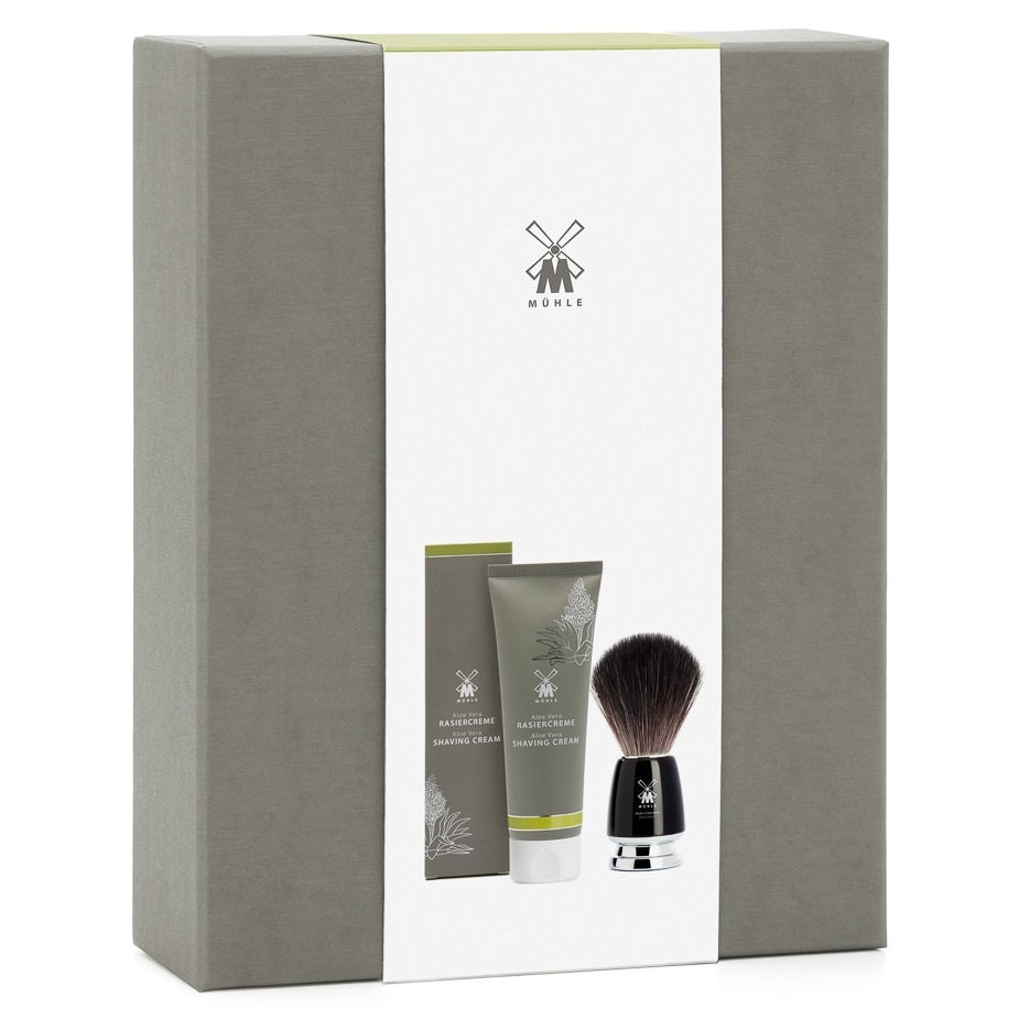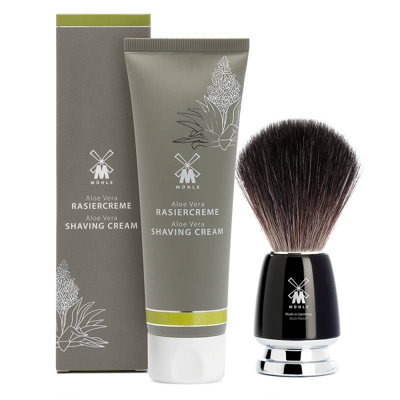Muhle Giftbox Starter Set is het ideale cadeau voor de moderne man die op zoek is naar een starter set voor luxe scheerbeurt. Deze stijlvolle set bevat de Scheercrème Aloe Vera, die de huid hydrateert en kalmeert met de verfrissende werking van aloë vera, en de Scheerkwast Black Fibre Rytmo Zwart, die zorgt voor een zijdezachte textuur voor het aanbrengen van scheerschuim. De scheerkwast heeft synthetische vezels die snel drogen en duurzaam zijn, wat de set perfect maakt voor dagelijks gebruik. De Muhle Giftbox Starter Set biedt een complete scheerbeurt met optimale verzorging, ideaal voor beginners die niet weten wat ze moeten kopen.
