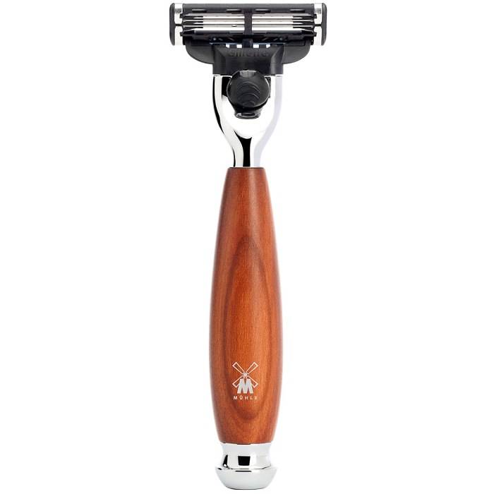 Muhle Mach3 Scheermes Vivo Pruimenhout is gemaakt van hoogwaardig pruimenboomhout, dat zorgvuldig is behandeld voor een lange levensduur en waterbestendigheid. Het handvat van pruimenhout biedt een comfortabele en stevige grip, terwijl de verchroomde metalen accenten zorgen voor een verfijnde, luxe uitstraling. Dit materiaal zorgt niet alleen voor een elegant uiterlijk, maar ook voor een lang levensduur en weerstand tegen slijtage, wat het scheermes ideaal maakt voor dagelijks gebruik.