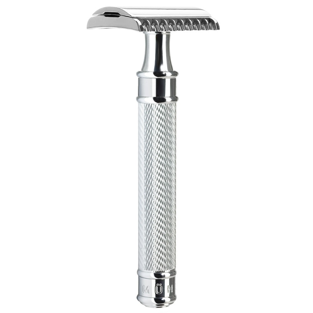 Muhle R41 Grande Double Edge Safety Razor is een klassiek open kam scheermes, ontworpen voor de ervaren natscheerder die zoeken naar een grondige en directe scheerbeurt. Dankzij het langere, zwaardere handvat biedt dit mes meer grip en controle, ideaal voor mannen met een stevige baardgroei. Het open kam ontwerp zorgt ervoor dat baardharen rechtop komen te staan voor een gladder resultaat met minder passes. Gemaakt van hoogwaardig verchroomd metaal straalt het mes luxe uit en is het goed bestand tegen slijtage. Een krachtig, stijlvol en duurzaam scheermes voor wie houdt van een traditionele, efficiënte scheerbeurt.