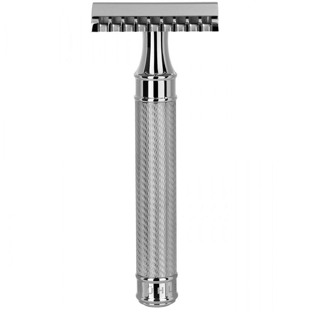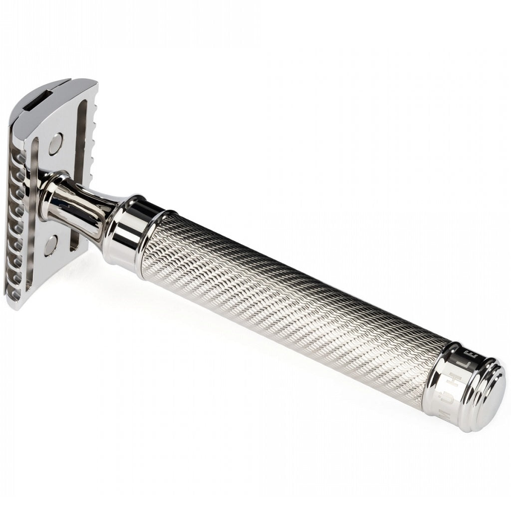 Muhle R41 GS Double Edge Safety Razor RVS is volledig gemaakt uit hoogwaardig roestvrij staal met een spiegelglans en een gepolijste afwerking. Dit materiaal staat bekend om zijn hoge corrosiebestendigheid en robuuste uitstraling. De gepolijste afwerking geeft het scheermes niet alleen een luxe uitstraling, maar zorgt er ook voor dat het gemakkelijk schoon te maken is en langdurig zijn kwaliteit behoudt. Dankzij het stevige roestvrij staal ligt het scheermes goed in de hand en biedt het optimale controle tijdens het scheren. Dit maakt de Muhle R41 GS een perfecte keuze voor wie op zoek is naar een premium scheerbeurt.