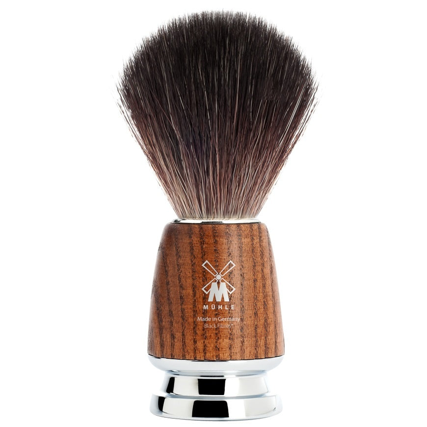 Muhle Scheerkwast Black Fibre Rytmo Essenhout is vervaardigd uit hoogwaardige hars, een synthetisch materiaal dat individueel wordt bewerkt en verfijnd voor een luxe uitstraling. De zwarte vezelharen van deze scheerkwast zijn het duurzame antwoord op hedendaagse behoeften, en bieden de look en feel van natuurlijk dassenhaar met een robuustere en duurzamere eigenschappen. Deze vezels zijn iets zachter aan de punt dan natuurlijk haar, wat resulteert in een comfortabele en luxueuze scheerervaring.