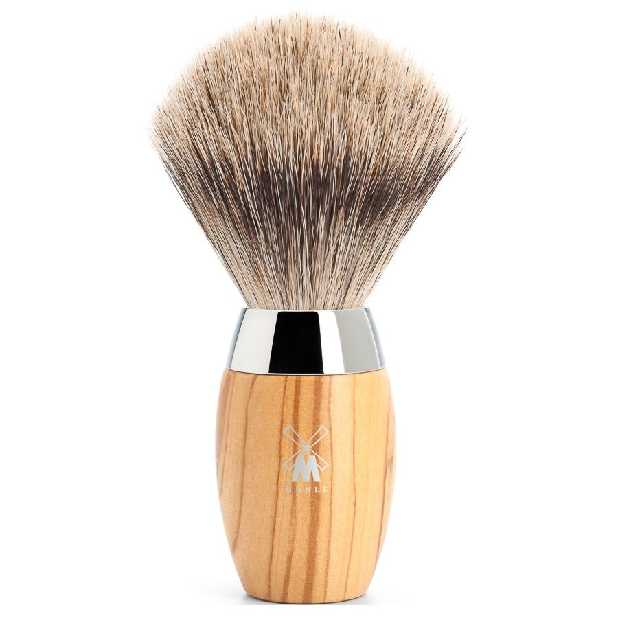 Muhle Scheerkwast Fijndas Kosmo Olijfhout (M) is gemaakt uit hoogwaardige materialen die duurzaamheid en luxe combineren. De kwast is gemaakt van bestbadger dassenhaar, een kwaliteit dassenhaar dat bekendstaat om zijn zachtheid en uitstekende wateropname. Dit haar zorgt voor een rijk schuim en een comfortabele, gelijkmatige verdeling van scheerzeep of -crème. Het handvat is gemaakt uit olijfhout en chroom, wat zorgt voor een elegante en natuurlijke uitstraling. Olijfhout is een sterk en slijtvast materiaal met een warme, karakteristieke nerf die elk handvat uniek maakt. De chroom accenten voegen niet alleen een luxe glans toe, maar zorgen ook voor extra stevigheid en vochtbestendigheid. Deze combinatie van materialen maakt de scheerkwast niet alleen functioneel, maar ook een stijlvol accessoire voor een verfijnde scheerervaring.