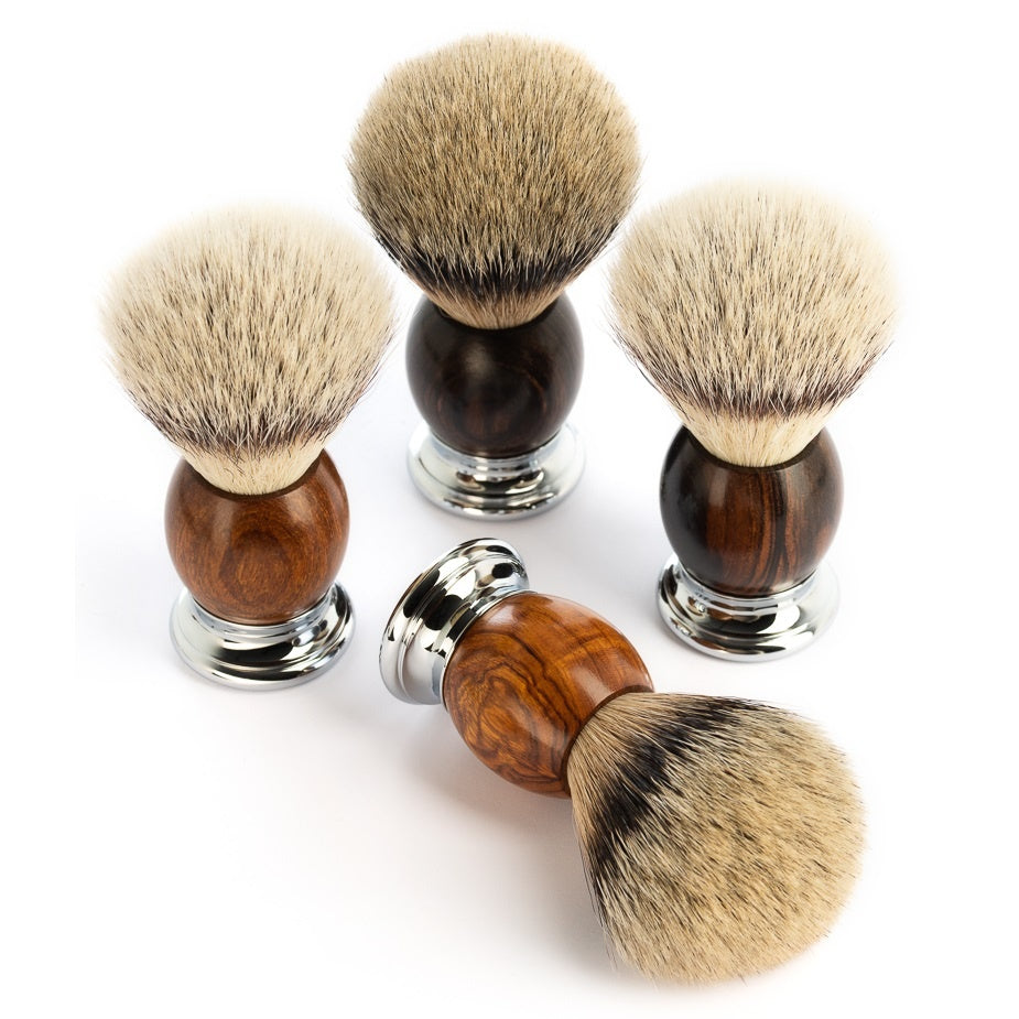 Muhle Scheerkwast Silvertip Sophist Ironwood (L) is een luxe scheerkwast met silvertip dassenhaar, de fijnste en zachtste variant, die zorgt voor een rijk schuim. Het handvat is gemaakt van ironwood, een duurzaam hardhout met een warme uitstraling en uniek nerfpatroon. Dankzij het formaat ligt de kwast prettig in de hand. De verchroomde messing afwerking biedt extra stabiliteit en luxe. Deze scheerkwast is een uitstekende keuze voor wie op zoek is naar zowel kwaliteit als stijl in hun scheerroutine.