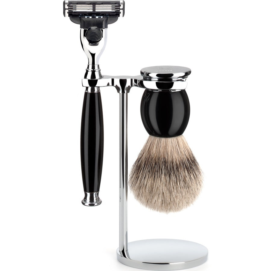 Muhle Scheerset Mach3 Sophist Zwart (3-delig) is de perfecte combinatie van luxe en functionaliteit voor de veeleisende man. Deze 3-delige set bestaat uit een scheermes, scheerkwast en standaard, allemaal met een elegante zwarte afwerking van gepolijst edelhars. Het scheermes is compatibel met Gillette Mach3 mesjes, wat zorgt voor een gladde en precieze scheerbeurt. De scheerkwast heeft zacht Silvertip dassenhaar, wat zorgt voor een rijk, romig schuim en een aangenaam gevoel op de huid. De scheerkwasthouder houdt de kwast en het mes netjes en hygiënisch opgeborgen. Deze set is ideaal voor mannen die zowel stijl als kwaliteit zoeken in hun dagelijkse scheerroutine.