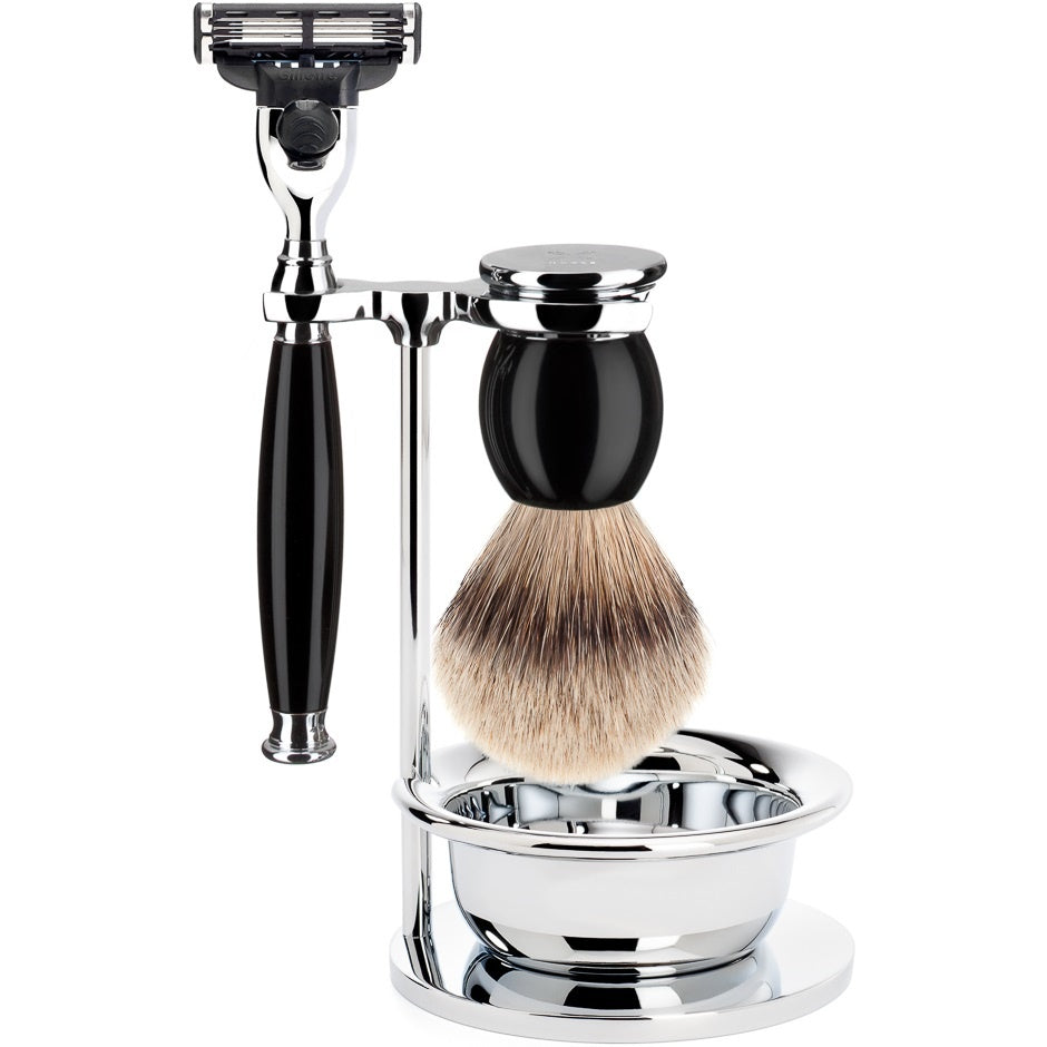 Muhle Scheerset Mach3 Sophist Zwart (4-delig) is de perfecte combinatie van luxe en functionaliteit voor de veeleisende man. Deze 4-delige set bestaat uit een scheermes, scheerkwast, standaard en een scheerkom, allemaal met een elegante zwarte afwerking van gepolijst edelhars. Het scheermes is compatibel met Gillette Mach3 mesjes, wat zorgt voor een gladde en precieze scheerbeurt. De scheerkwast heeft zacht Silvertip dassenhaar, wat zorgt voor een rijk, romig schuim en een aangenaam gevoel op de huid. De scheerkwasthouder houdt de kwast en het mes netjes en hygiënisch opgeborgen. Deze set is ideaal voor mannen die zowel stijl als kwaliteit zoeken in hun dagelijkse scheerroutine.