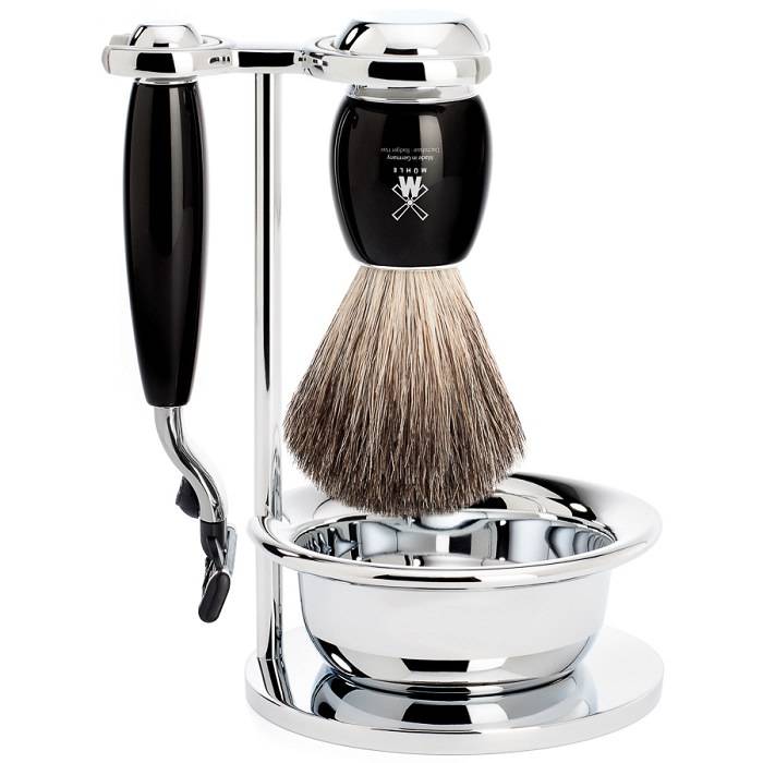 Muhle Scheerset Mach3 Vivo Zwart (4-delig) combineert stijl en functionaliteit voor een comfortabele scheerbeurt. De set bestaat uit een Mach3 scheermes, een graudas scheerkwast, een standaard en een zeepbakje. Het handvat van gepolijst edelhars biedt een luxe uitstraling en een prettige grip. De scheerkwast met graudas dassenhaar, zorgt voor een zacht scheerschuim, terwijl de Mach3 mesjes zorgt voor een gladde en comfortabele scheerbeurt. De set wordt compleet geleverd met een standaard voor een opgeruimde opslag. Perfect voor wie waarde hecht aan kwaliteit en design in zijn scheerroutine.