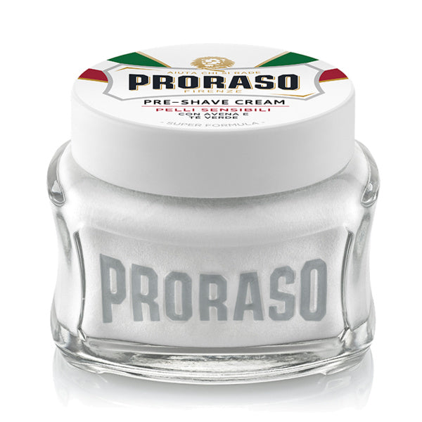 Proraso White Sensitive Pre-Shave Cream is speciaal ontwikkeld voor de gevoelige huid. Deze crème bereidt de huid perfect voor op het scheren, verzacht de baardharen en zorgt voor een gladde en comfortabele scheerervaring. De formule, verrijkt met groene thee en haverextract, kalmeert en hydrateert de huid, terwijl de toegevoegde glycerine zorgt voor een soepele scheerbeweging. Voeg deze pre-shave crème toe aan je scheerroutine voor een verzorgde en irritatievrije huid. Ervaar het comfort van een professionele scheerbeurt met Proraso.