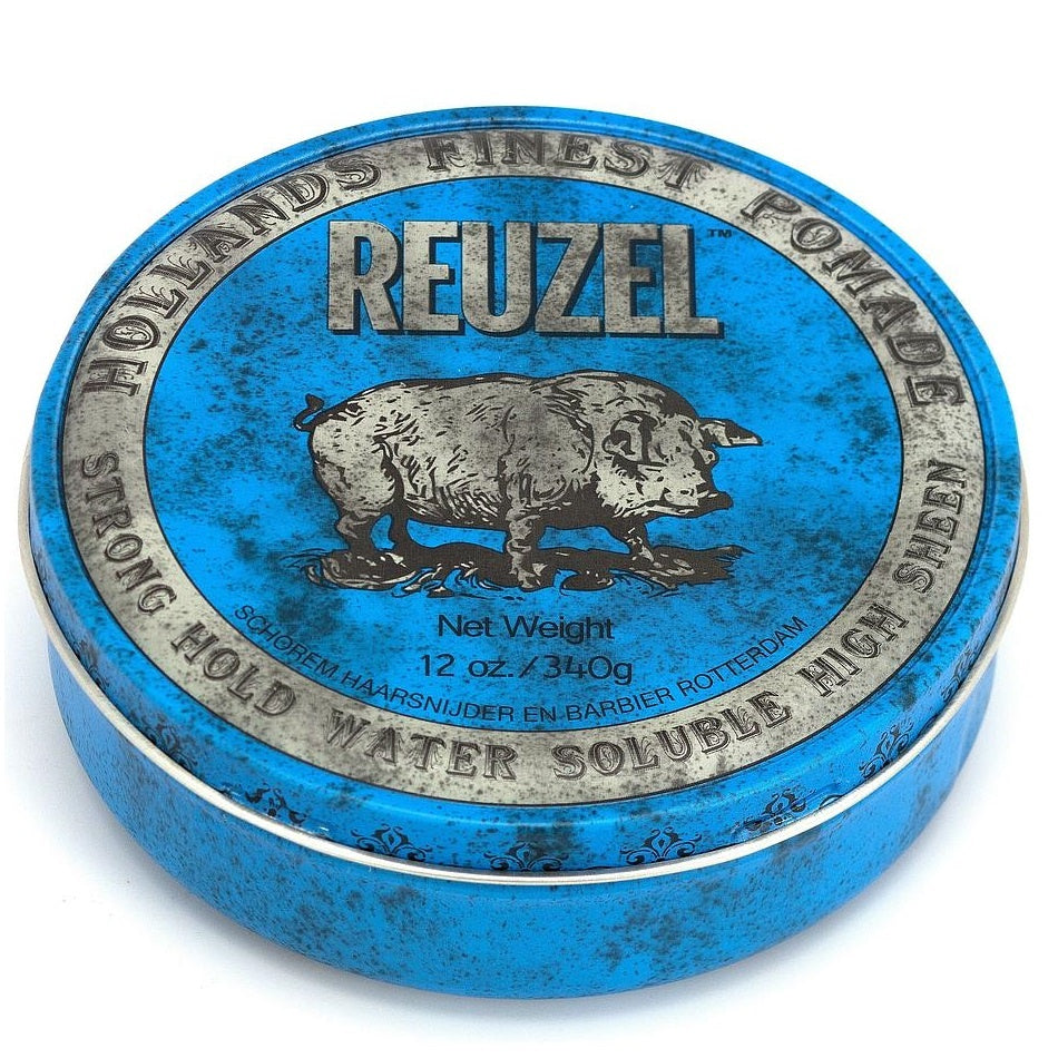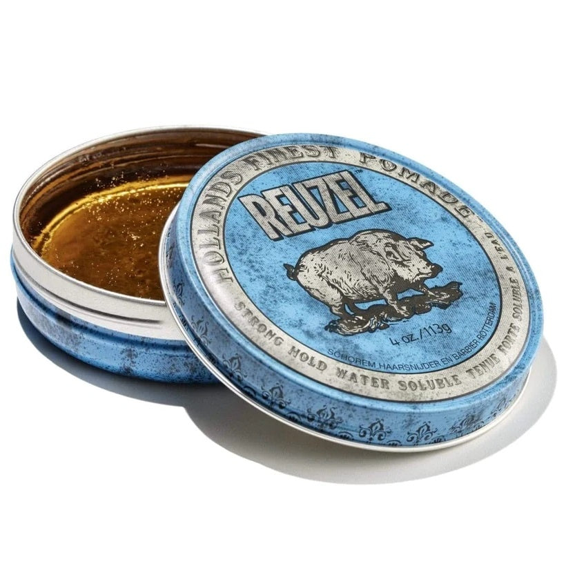 Reuzel Blue Strong Hold Pomade bezit een warme geur van vanille en hout.