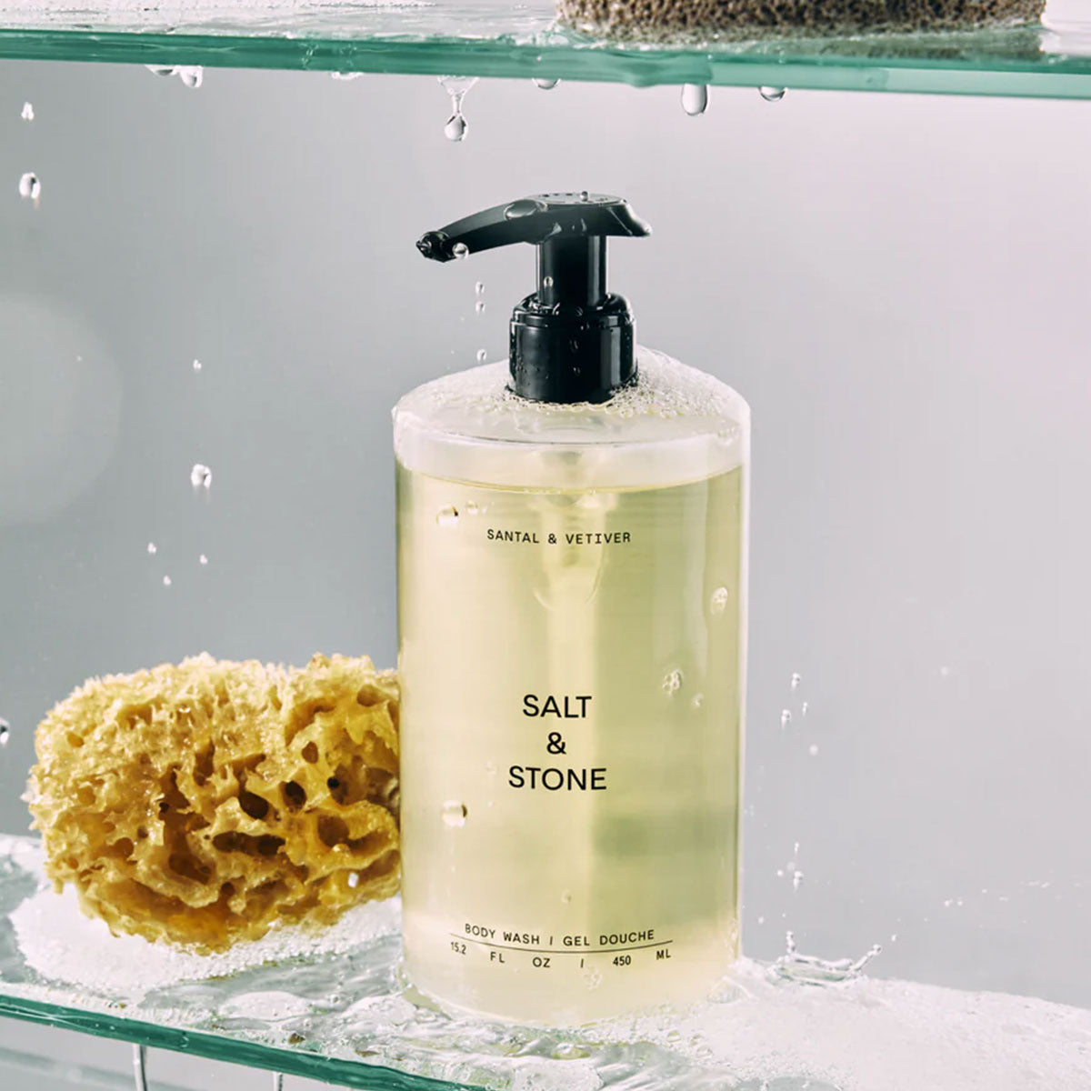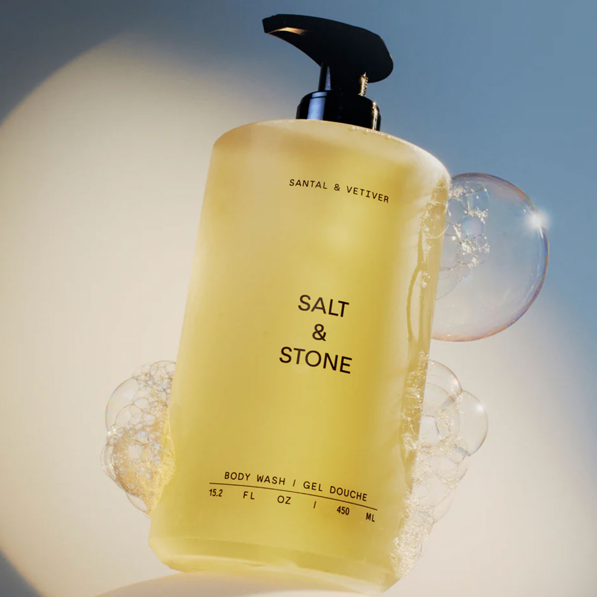 Salt & Stone Body Wash Santal & Vetiver is een ideale dagelijkse reiniger voor een gezonde, stralende huid. Deze body wash bevat een rijke mix van natuurlijke, plantaardige ingrediënten uit de oceaan, antioxidanten en hydraterende elementen om de huid te herstellen. Dankzij de krachtige combinatie van zeewierextracten en spirulina wordt de geïrriteerde en aan de elementen blootgestelde huid op milde wijze gekalmeerd en geregenereerd. De antioxidanten in het bosbessenextract en vitamine C beschermen de huid tegen schadelijke effecten van vrije radicalen die ontstaan door blootstelling aan de zon. Niacinamide, ook wel bekend als vitamine B3, heeft een bewezen effect op het creëren van een sterkere, gezonde huidbarrière en het verbeteren van de huidtextuur. Hyaluronzuur zorgt voor een diepe hydratatie tijdens het reinigen en de toevoeging van probiotica behoudt de natuurlijke balans van de huid.
