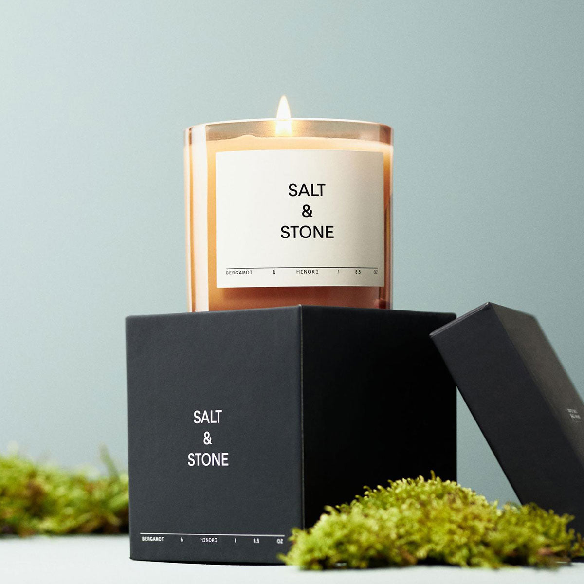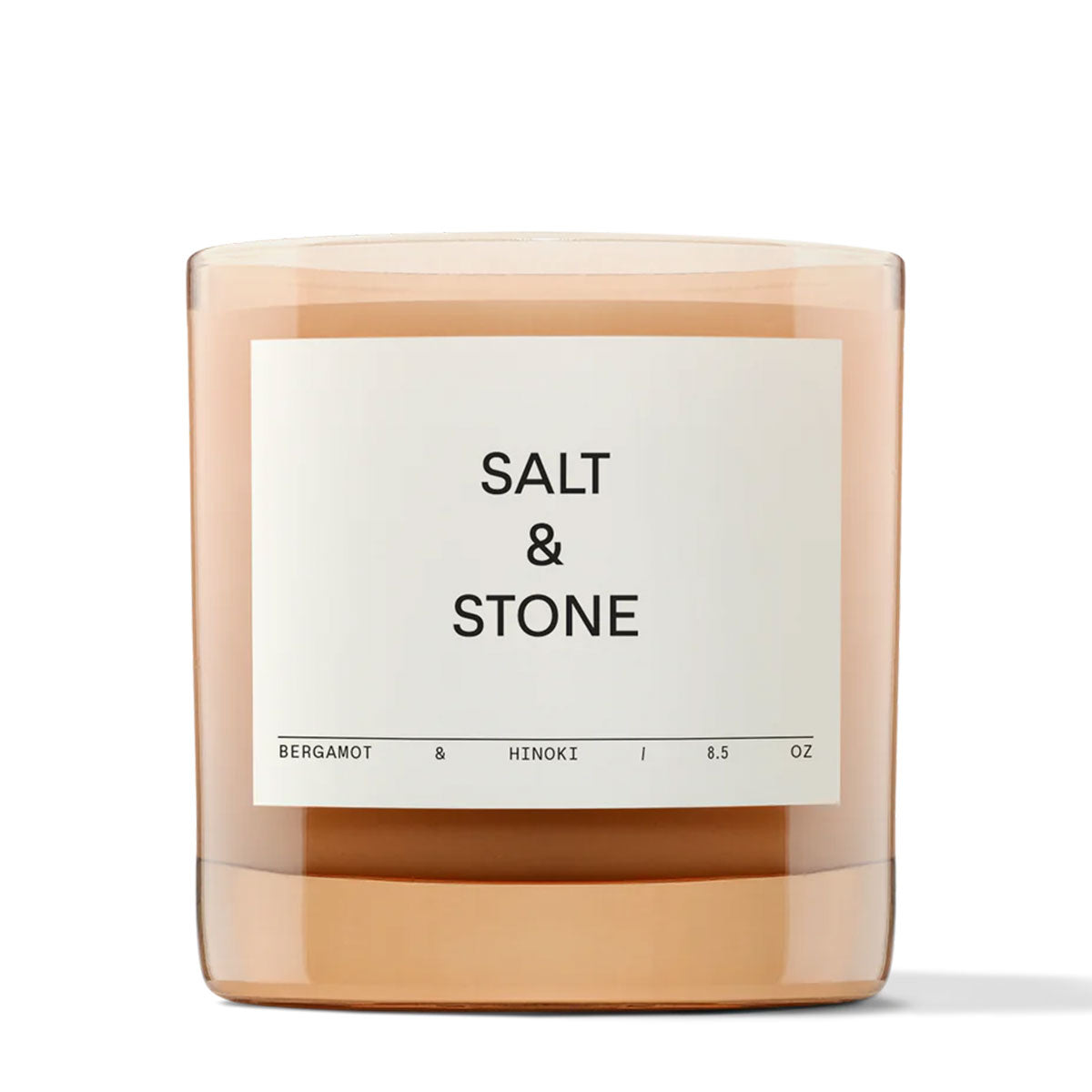 Salt & Stone Bergamot & Hinoki Candle brandt tot 50 uur met een verfrissende, warme geur in een herbruikbaar glazen potje, perfect voor elke ruimte. Lees meer