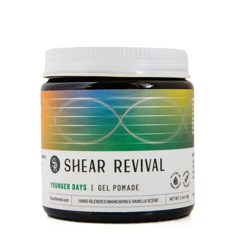 Shear Revival Younger Days Gel Pomade, met natuurlijke, verzorgende ingrediënten, biedt een glanzende, medium hold en een verfrissende mandarijn en vanille geur. Lees meer