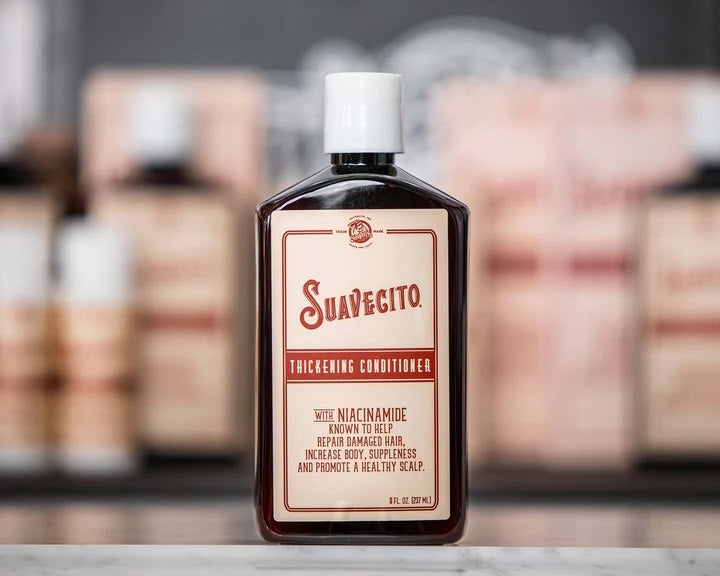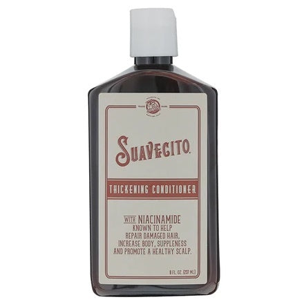 Suavecito Thickening Conditioner is de ideale partner voor wie op zoek is naar voller en dikker haar. Deze hoogwaardige conditioner is speciaal samengesteld om dunner wordend haar te versterken en extra volume te geven. De formule is verrijkt met vitamines en voedende ingrediënten die je haar revitaliseren en versterken, terwijl ze klitten en knopen helpen voorkomen. Na gebruik voelt je haar zacht en veerkrachtig aan, met een vollere uitstraling en een gezonde glans. Suavecito Thickening Conditioner is geschikt voor dagelijks gebruik en vormt de perfecte aanvulling op je haarroutine. Voeg deze conditioner toe aan je verzorgingsritueel voor zichtbaar dikker haar dat straalt van gezondheid en vitaliteit.