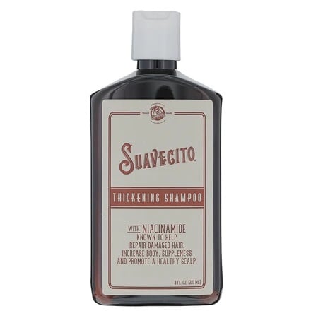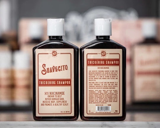 Suavecito Thickening Shampoo is verrijkt met een krachtige formule die gericht is op het bevorderen van dikker en voller haar. Met niacinamide als sleutelingrediënt, bekend als vitamine B3, stimuleert deze shampoo de haargroei en herstelt het beschadigd haar, terwijl het ook zorgt voor meer body en soepelheid voor een dikkere uitstraling. Naast niacinamide bevat het rozemarijnolie om de haargroei te bevorderen, panthenol voor verdikking en vochtbehoud, aloë vera om een gezonde hoofdhuid te bevorderen en beschadigd haar te herstellen. Geniet van een vollere haardos en hernieuwd zelfvertrouwen met deze doeltreffende shampoo.