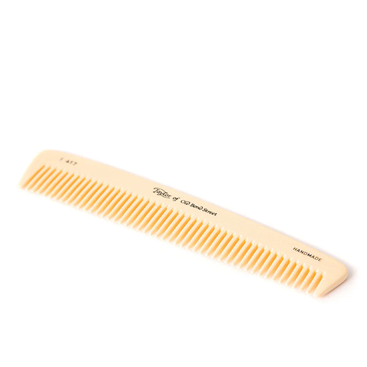 Taylor of Old Bond Street Herenkam Ivoor I417 is een grote, met de hand gemaakte kam van hoogwaardig imitatie ivoor. Met een lengte van 18 cm ligt hij prettig in de hand en biedt hij een klassieke, verzorgde uitstraling. De kam heeft zowel grove als fijne tanden, waardoor hij geschikt is voor verschillende haartypes. De afgeronde tanden zorgen voor een comfortabele haarverzorging zonder de hoofdhuid te irriteren of te beschadigen. Dankzij het duurzame materiaal en de zorgvuldige afwerking is deze kam een praktisch en stijlvol hulpmiddel voor dagelijks gebruik.