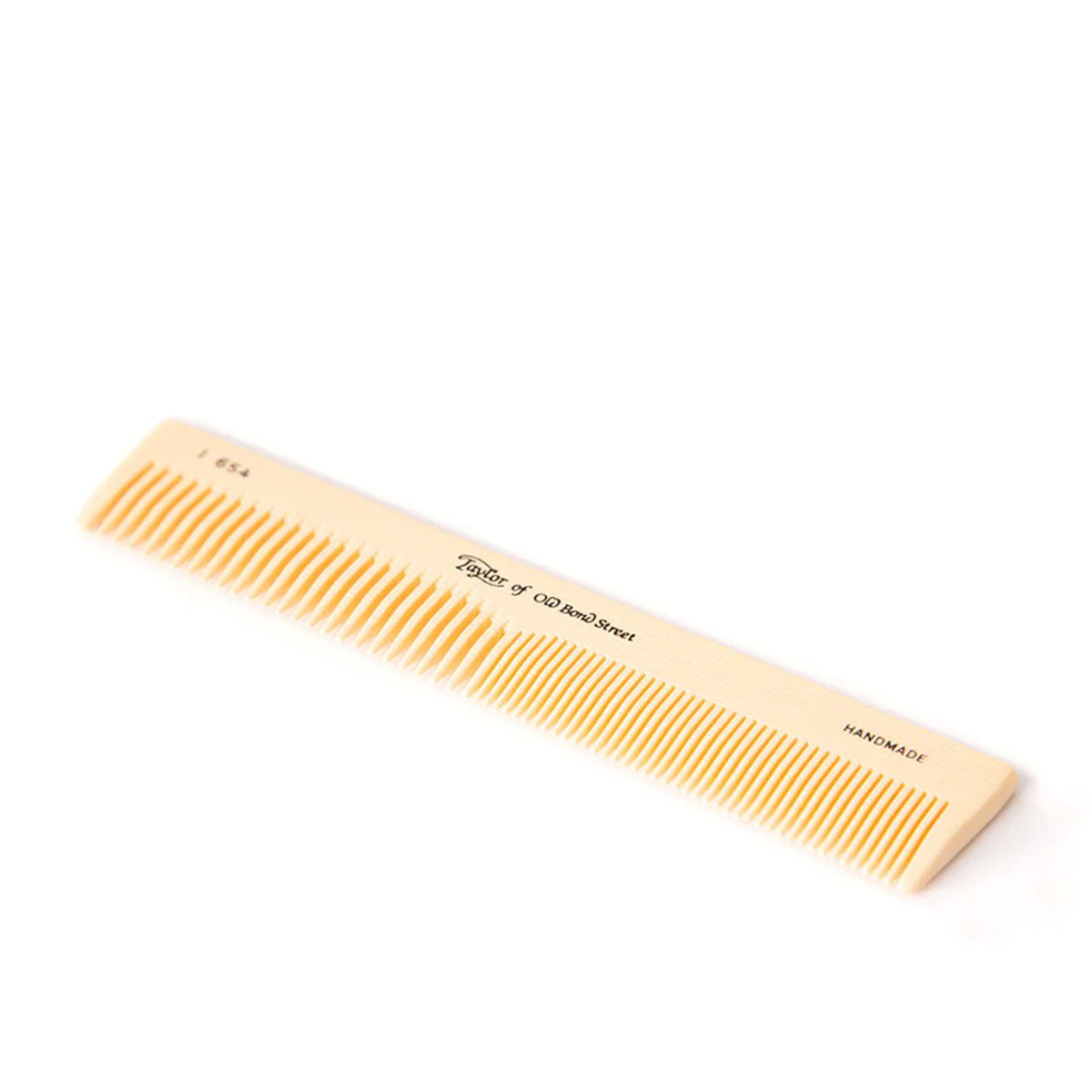 Taylor of Old Bond Street Herenkam Ivoor I654 is een grote, met de hand gemaakte kam van hoogwaardig imitatie ivoor. Met een lengte van 12,5 cm ligt hij prettig in de hand en is gemakkelijk mee te nemen. De kam heeft zowel grove als fijne tanden, waardoor hij geschikt is voor verschillende haartypes. De afgeronde tanden zorgen voor een comfortabele haarverzorging zonder de hoofdhuid te irriteren of te beschadigen. Dankzij het duurzame materiaal en de zorgvuldige afwerking is deze kam een praktisch en stijlvol hulpmiddel voor dagelijks gebruik.