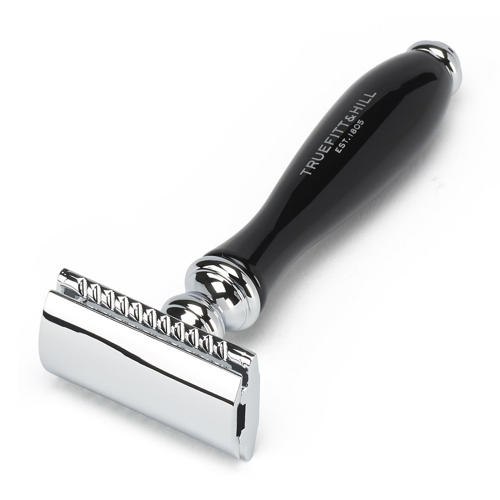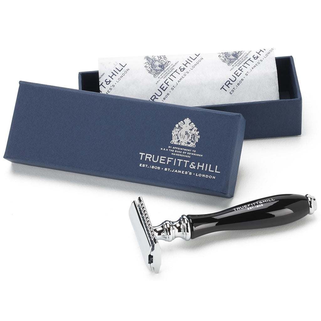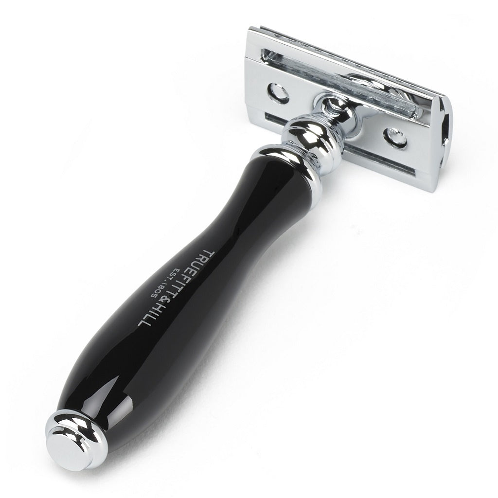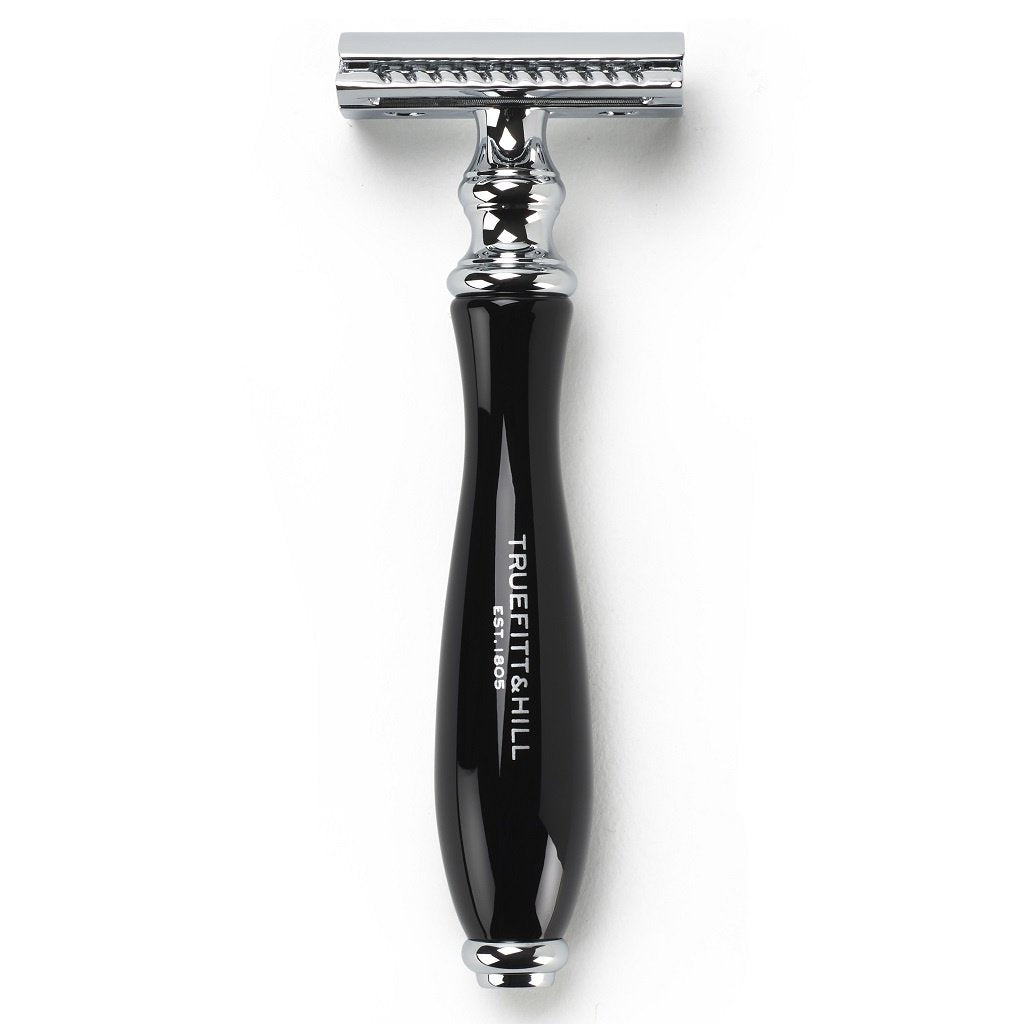 Truefitt & Hill Double Edge Safety Razor Wellington Zwart combineert vakmanschap en functionaliteit met zijn speciaal verzwaarde en ergonomisch handgemaakte scheermessen. Deze zijn ontworpen om je de gladste en veiligste scheerbeurt te geven. Het kunsthars handvat, in een elegante zwarte afwerking, biedt een luxueuze en stevige grip voor optimale controle. Dit klassieke ontwerp zorgt niet alleen voor een superieure scheerbeurt, maar voegt ook een vleugje verfijning toe aan je dagelijkse routine.