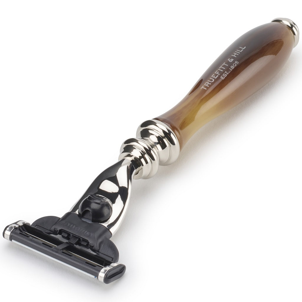 Truefitt & Hill Mach3 Scheermes Wellington Hoorn is voorzien van verzwaarde en ergonomisch handgemaakte scheerhendels, ontworpen om je de gladste en veiligste scheerbeurt te geven. Deze zorgvuldig vervaardigde handgreep, gemaakt van hoogwaardig materiaal, biedt een perfecte balans en grip, wat resulteert in ultieme controle tijdens het scheren. De precisie van de Mach3-scheermesjes, gecombineerd met de elegante en duurzame handgreep, zorgt ervoor dat elke scheerbeurt moeiteloos en comfortabel verloopt. Truefitt & Hill heeft met dit scheermes een perfecte combinatie van traditioneel vakmanschap en moderne technologie gecreëerd, waardoor het een onmisbaar item is voor de verfijnde gentleman.