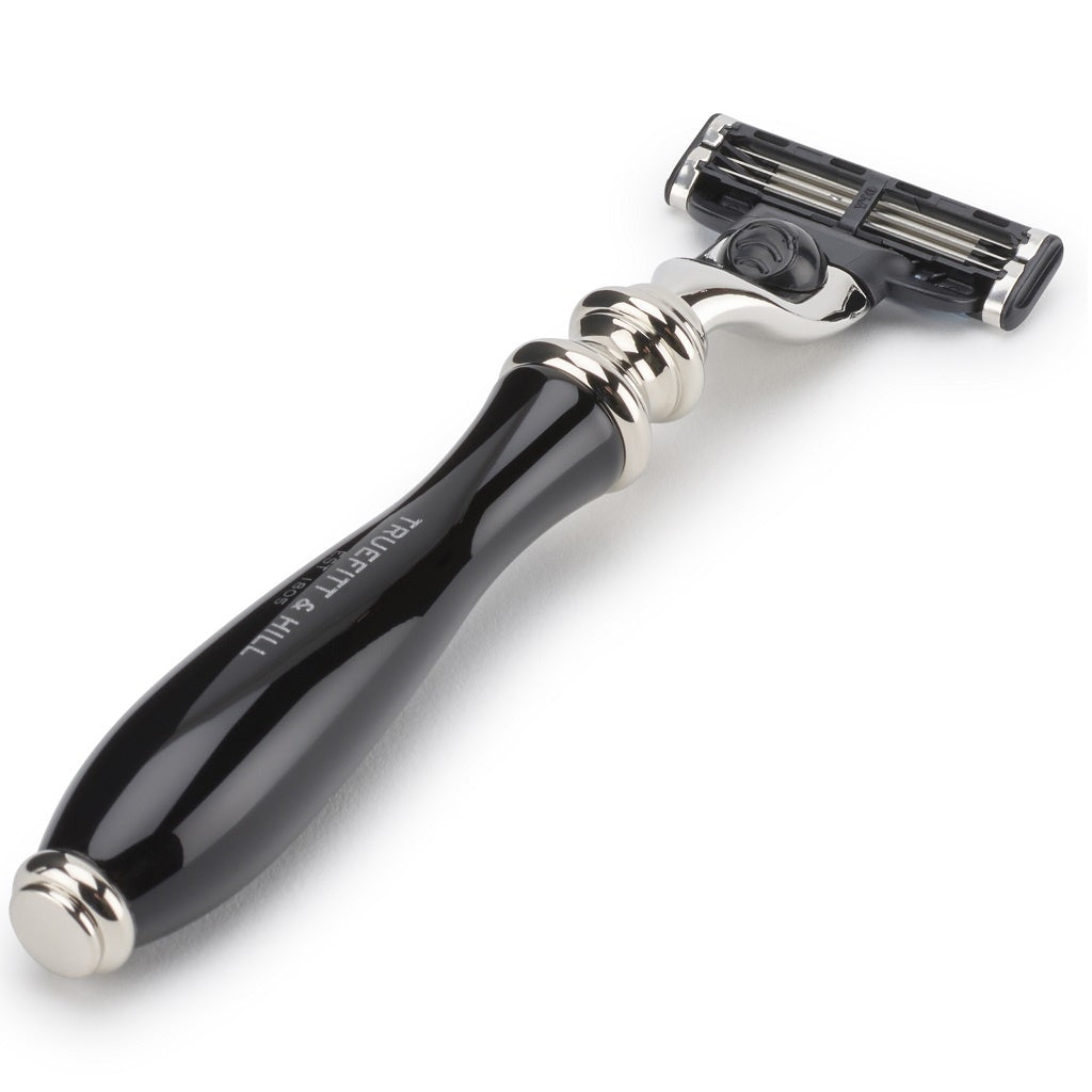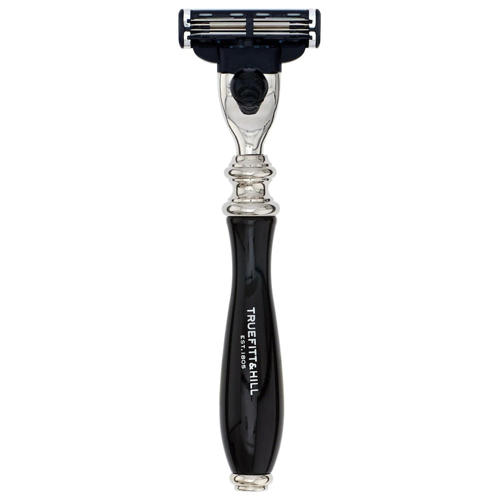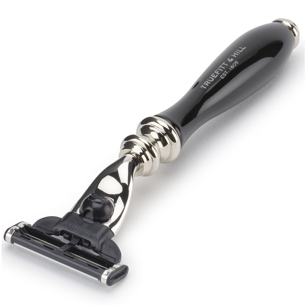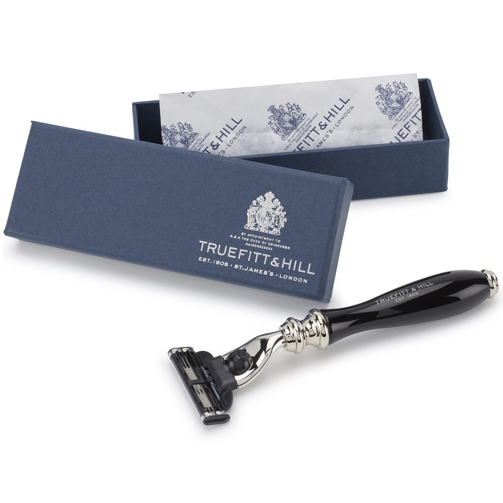 Truefitt & Hill Mach3 Scheermes Wellington Zwart is voorzien van verzwaarde en ergonomisch handgemaakte scheerhendels, ontworpen om je de gladste en veiligste scheerbeurt te geven. Deze zorgvuldig vervaardigde handgreep, gemaakt van hoogwaardig materiaal, biedt een perfecte balans en grip, wat resulteert in ultieme controle tijdens het scheren. De precisie van de Mach3-scheermesjes, gecombineerd met de elegante en duurzame handgreep, zorgt ervoor dat elke scheerbeurt moeiteloos en comfortabel verloopt. Truefitt & Hill heeft met dit scheermes een perfecte combinatie van traditioneel vakmanschap en moderne technologie gecreëerd, waardoor het een onmisbaar item is voor de verfijnde gentleman.