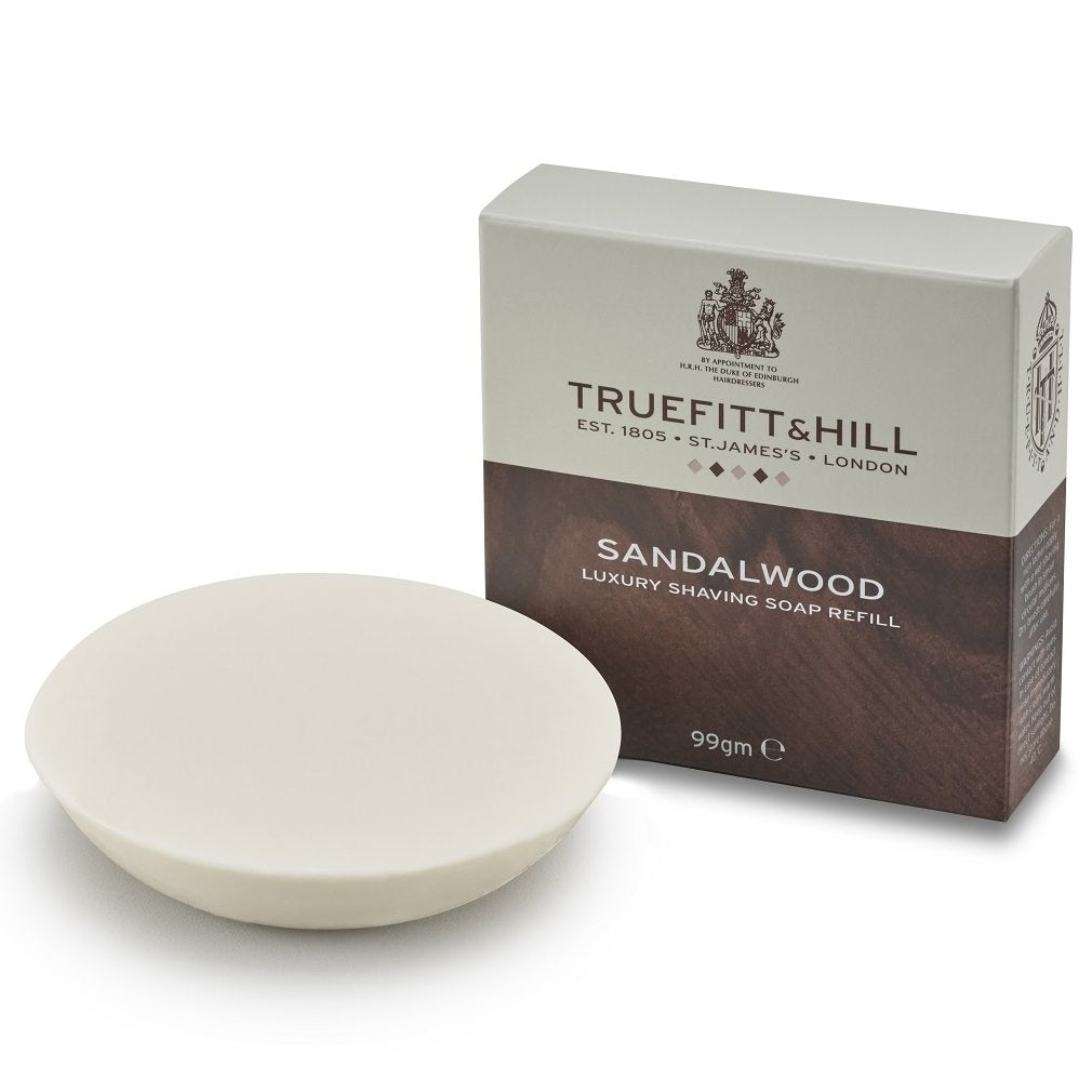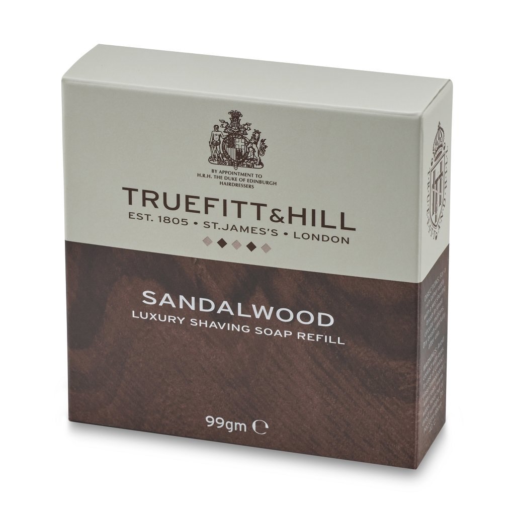 Truefitt & Hill Sandalwood Scheerzeep - Navulverpakking is een luxueuze scheerzeep die zorgt voor een ultieme scheerbeurt. De zeep is verrijkt met voedende ingrediënten die de huid kalmeren en verzachten, terwijl ze een rijk en romig schuim creëren voor een gladde scheerbeurt. De sandalwood geur combineert een warme, verfijnde geur met kruidige en citrusachtige topnoten, een bloemig hart, en een rijke basis van sandelhout, amber en muskus. Deze premium scheerzeep hydrateert en beschermt de huid, waardoor irritaties en roodheid worden verminderd. Geleverd met een handgedraaide en gepolijste houten kom die geschikt is voor navullingen.