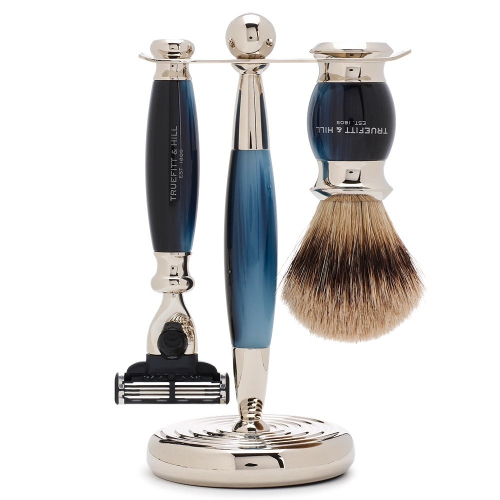Truefitt & Hill Scheerset Mach3 Edwardian Blauw is een stijlvolle en luxueuze scheerset voor de moderne gentleman. De set bevat een perfect uitgebalanceerd scheermes, bijpassende handgemaakte scheerkwast van fijn dassenhaar en elegante chromen standaard. Prachtig met de hand afgewerkt een elegante, blauwe tint wat zorgt voor een tijdloze en stijlvolle uitstraling.