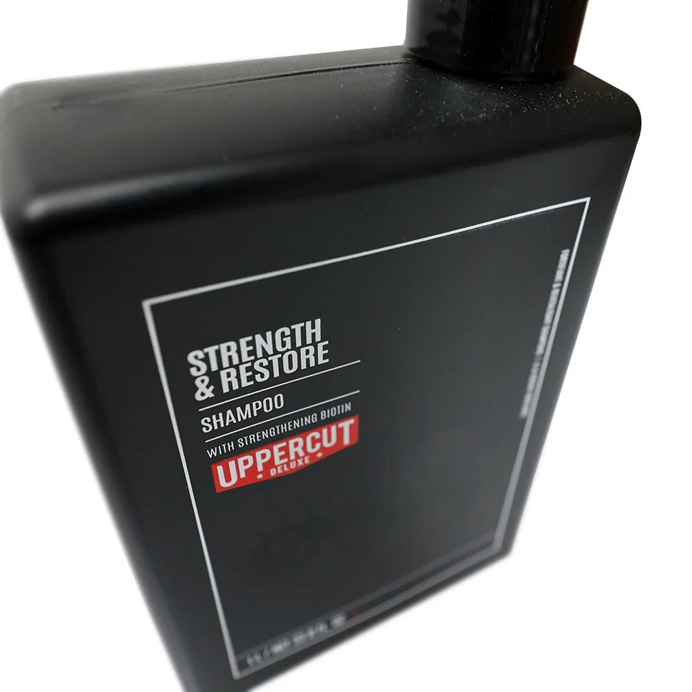Uppercut Deluxe Strength & Restore Shampoo heeft een unieke formule die speciaal is ontworpen om het haar diep te reinigen en tegelijkertijd te voeden en versterken. De shampoo bevat biotine, een essentiële vitamine die bekend staat om zijn vermogen om het haar te versterken en te herstellen. Naast biotine bevat de formule ook cafeïne, een krachtige stimulans die de hoofdhuid en het haar stimuleert voor een frisse en schone uitstraling. De formule van deze shampoo creëert een dik schuim dat het haar grondig reinigt en productresten, vuil en overtollige olie verwijdert. Tegelijkertijd voedt en versterkt het de haarzakjes, waardoor het haar er voller en gezonder uitziet. Dit maakt Uppercut Deluxe Strength & Restore Shampoo ideaal voor mannen die op zoek zijn naar een effectieve en kwalitatieve haarverzorgingsroutine.