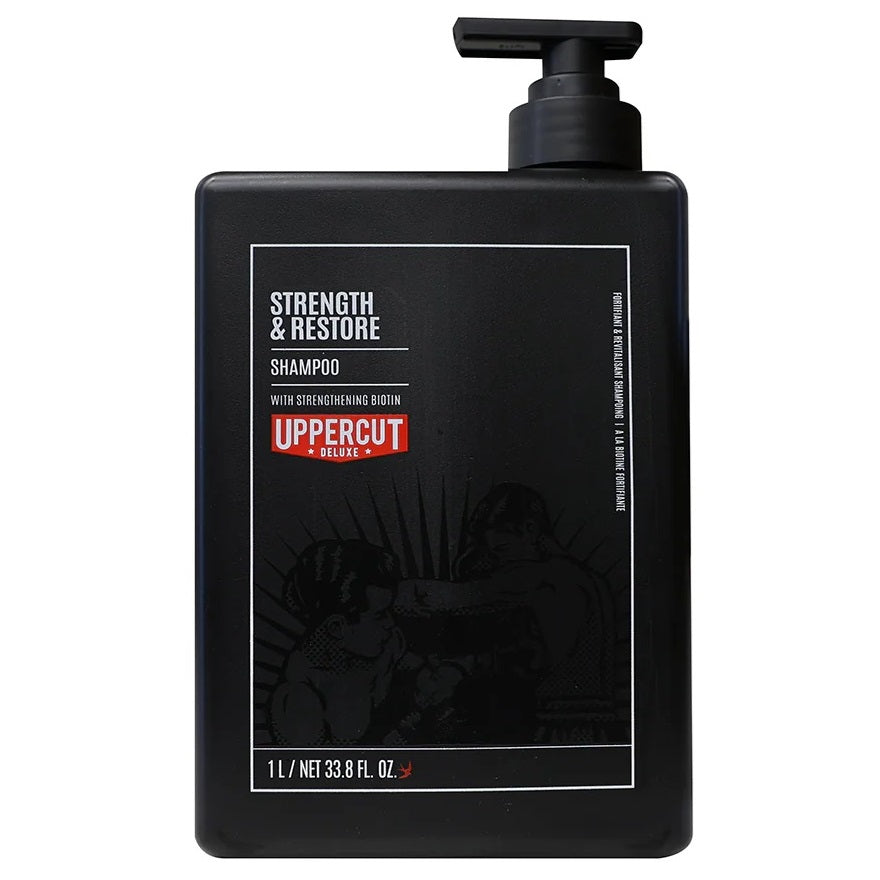 Uppercut Deluxe Strength & Restore Shampoo is een premium shampoo die speciaal is ontworpen voor mannen die op zoek zijn naar een diepe reiniging en versterking van hun haar. Deze shampoo is verrijkt met een krachtige formule van natuurlijke ingrediënten die helpen bij het verwijderen van vuil, olie en productresten, terwijl het haar wordt gevoed en versterkt. De shampoo is geschikt voor alle haartypes, van normaal, droog tot beschadigd haar en kan dagelijks worden gebruikt om het haar schoon, sterk en gezond te houden. Het is een must-have voor mannen die op zoek zijn naar een effectieve en kwalitatieve haarverzorgingsroutine.